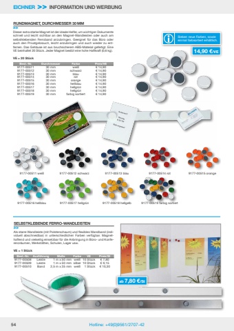 54 Hotline: +49(0)9561/2707-42EICHNER >> INFORMATION UND WERBUNGDieser extra starke Magnet ist der ideale Helfer, um wichtigen Dokumente schnell und leicht sichtbar an den Magnet-Wandleisten oder auch am selbstklebenden Ferroband anzubringen. Geeignet f%u00fcr das B%u00fcro oder auch den Privatgebrauch, leicht anzubringen und auch wieder zu entfernen. Das Geh%u00e4use ist aus bruchsicherem ABS-Material gefertigt. Eine VE beinhaltet 20 St%u00fcck. Jeder Magnet besitzt eine hohe Haftkraft (0,6 kg).VE = 20 St%u00fcck9177-00511 wei%u00df9177-00516 hellblau9177-00512 schwarz9177-00517 hellgr%u00fcn9177-00513 blau9177-00518 hellgelb9177-00514 rot9177-00519 farbig sortiert9177-00515 orangeRUNDMAGNET, DURCHMESSER 30 MM>>Best.-Nr. Durchmesser Farbe Preis/VE9177-00511 30 mm wei%u00df %u20ac 14,909177-00512 30 mm schwarz %u20ac 14,909177-00513 30 mm blau %u20ac 14,909177-00514 30 mm rot %u20ac 14,909177-00515 30 mm orange %u20ac 14,909177-00516 30 mm hellblau %u20ac 14,909177-00517 30 mm hellgr%u00fcn %u20ac 14,909177-00518 30 mm hellgr%u00fcn %u20ac 14,909177-00519 30 mm farbig sortiert %u20ac 14,9014,90 %u20ac/VESieben neue Farben, sowie einmal farbsortiert erh%u00e4ltlich. Als starre Wandleiste (mit Polsterschaum) und flexibles Wandband (individuell abschneidbar) in unterschiedlichen Farben verf%u00fcgbar. Magnethaftend und vielseitig einsetzbar f%u00fcr die Anbringung in B%u00fcro- und Konferenzr%u00e4umen, Werkst%u00e4tten, Schulen, Lager usw.VE = 1 St%u00fcckSELBSTKLEBENDE FERRO-WANDLEISTEN>>Best.-Nr. Ausf%u00fchrung Ma%u00dfe Farbe VE Preis/St9177-00508 Leiste 1 m x 50 mm wei%u00df 10 St%u00fcck %u20ac 7,809177-00509 Leiste 1 m x 50 mm silber 10 St%u00fcck %u20ac 9,159177-00510 Band 2,5 m x 35 mm wei%u00df 1 St%u00fcck %u20ac 10,30ab 7,80 %u20ac/St