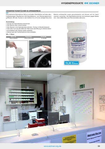 www.eichner-org.de 59Die praktische Spenderbox h%u00e4lt zur schnellen Desinfektion auf allen alkoholbest%u00e4ndigen Oberfl%u00e4chen 200 Desinfektions- und Reinigungst%u00fcchern griffbereit. Mit den T%u00fcchern in der Gr%u00f6%u00dfe 215 x 215 mm reinigen Sie ohne Bleiche schlierenfrei sowie geruchsneutral und k%u00f6nnen auf ein Nachwischen verzichten. Die Desinfektionst%u00fccher sind wirksam gegen Bakterien, Viren (HBV/HIV) und Pilze (Candida albicans).DESINFEKTIONST%u00dcCHER IN SPENDERBOX>>Anwendung:%u2022 Deckel der Spenderdose abnehmen%u2022 Den Beutel oben aufschneiden%u2022 Den Beutel in die Spenderdose stecken, T%u00fccher im Beutel belassen%u2022 Das erste Tuch aus der Mitte der Rolle durch die %u00d6ffnung im Deckel ziehen%u2022 Anschlie%u00dfend den Deckel wieder aufsetzen%u2022 Deckel nach der Tuchentnahme immer schlie%u00dfenVE = 1 DoseBest.-Nr. Tuchma%u00dfe Preis/VE9127-01819 215 x 215 mm %u20ac 19,3019,30 %u20ac/DoseHYGIENEPRODUKTE << EICHNER