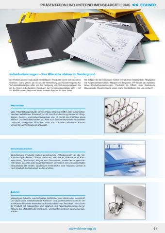 www.eichner-org.de 61PR%u00c4SENTATION UND UNTERNEHMENSDARSTELLUNG << EICHNERIndividualisierungen - Ihre W%u00fcnsche stehen im VordergrundDie Vielfalt unserer individuell herstellbaren Produkte kennt nahezu keine Grenzen. Ganz gleich, ob es um die Herstellung von Mustermappen f%u00fcr Vertriebsabteilungen oder um die Fertigung von Schulungsmappen bis hin zu Ihrem individuellem Ringbuch zur Firmenpr%u00e4sentation geht - mit EICHNER haben Sie immer einen starken Partner an Ihrer Seite.Wir fertigen f%u00fcr Sie individuelle Ordner mit diversen Mechaniken, Ringb%u00fccher mit Kugelschreiberhaltern, Mappen mit Registern, PP-Boxen als repr%u00e4sentative Produktverpackungen, Produkte im Offset- oder Siebdruck, Mousepads, Flipcharts und vieles mehr. Kontaktieren Sie uns einfach!MechanikenViele Pr%u00e4sentationsprodukte k%u00f6nnen Papier, Register, Hefter oder Dokumententaschen aufnehmen. Passend zur 80 mm Euro-Lochung bieten wir Ring-, B%u00fcgel-, Combi-, und Hebelmechaniken von 10 bis 80 mm F%u00fcllh%u00f6he sowie Klemm- und Steck-Mechaniken an. Aber auch Sondermechaniken mit anderem Lochma%u00df, %u00fcbergro%u00dfen F%u00fcllh%u00f6hen oder aus speziellen Materialen k%u00f6nnen wir auf Ihre Anforderungen anpassen.VerschlussvariantenVerschiedene Produkte haben verschiedene Anforderungen an die Verschlussm%u00f6glichkeiten. Diverse Varianten, wie Steck-, Klemm- oder Klettverschluss, Druckknopf, Magnet und Gummiband sowie Deckel gesichert mit Haken, Laschen oder sogar Schl%u00f6ssern verhindern ein unbeabsichtigtes herausfallen der Inhalte. Zus%u00e4tzliche Innendeckel und -klappen k%u00f6nnen je nach Produkt die Sicherheit weiter erh%u00f6hen.Vielseitiges Zubeh%u00f6r, wie Stifthalter, Griffl%u00f6cher aus Metall oder Kunststoff, CD-Clips sowie selbstklebende Klarsicht- und Visitenkartentaschen in verschiedenen Formaten erweitern die Funktionalit%u00e4t Ihres Produktes. Wir k%u00f6nnen Ihr Produkt mit Tragegriffen und -laschen, mit Kolumbusklemmen zur Erh%u00f6hung der Stabilit%u00e4t oder mit Ecken- und Kantenschonern aus Metall ausstatten.Zubeh%u00f6r
