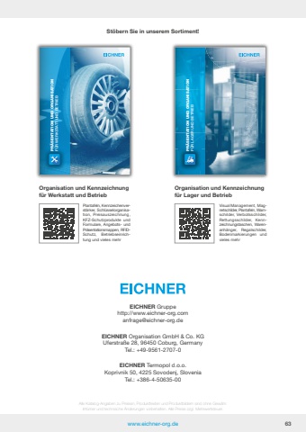 www.eichner-org.de 63EICHNER Gruppehttp://www.eichner-org.comanfrage@eichner-org.deEICHNER Organisation GmbH & Co. KGUferstra%u00dfe 28, 96450 Coburg, GermanyTel.: +49-9561-2707-0EICHNER Termopol d.o.o.Koprivnik 50, 4225 Sovodenj, SloveniaTel.: +386-4-50635-00St%u00f6bern Sie in unserem Sortiment!Organisation und Kennzeichnung f%u00fcr Werkstatt und BetriebPR%u00c4SENTATION UND ORGANISATION F%u00dcR LAGER UND BETRIEBOrganisation und Kennzeichnung f%u00fcr Lager und BetriebPlantafeln, Kennzeichenverst%u00e4rker, Schl%u00fcsselorganisation, Preisauszeichnung, KFZ-Schutzprodukte und Formulare, Angebots- und Pr%u00e4sentationsmappen, RFIDSchutz, Betriebseinrichtung und vieles mehrVisual Management, Magnetschilder, Plantafeln, Warnschilder, Verbotsschilder, Rettungsschilder, Kennzeichnungstaschen, Warenanh%u00e4nger, Regalschilder, Bodenmarkierungen und vieles mehrAlle Katalog-Angaben zu Preisen, Produkttexten und Produktbildern sind ohne Gew%u00e4hr.Irrt%u00fcmer und technische %u00c4nderungen vorbehalten. Alle Preise zzgl. Mehrwertsteuer.PR%u00c4SENTATION UND ORGANISATION F%u00dcR WERKSTATT UND BETRIEB