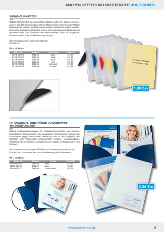 www.eichner-org.de 9MAPPEN, HEFTER UND SICHTB%u00dcCHER << EICHNERStabile Klemmhefter aus umweltfreundlicher, 0,45 mm starker Polypropylen-Folie. Der schwenkbare Clip erm%u00f6glicht eine schnelle und einfache Bef%u00fcllung des Hefters; die Dokumente m%u00fcssen dabei nicht gelocht werden. Der Hefter fasst bis zu 50 Seiten. Durch semi-transparentes Material wird die erste Seite zum Deckblatt des Klemmhefters. Ideal f%u00fcr Angebote, Pr%u00e4sentationen oder als Bewerbungsmappe.Semi-transparentes, farbloses Materialf%u00fcr DIN A4VE = 25 St%u00fcckStabile Pr%u00e4sentationsmappe mit Visitenkartenschlitzen aus umweltfreundlichem Polypropylen. Die integrierten Innentaschen sichern die Dokumente gegen herausfallen. Weiterhin kann in den vorgestanzten Schlitzen eine Visitenkarte untergebracht werden. Herausklappbare Abheftlaschen im R%u00fccken erm%u00f6glichen die Ablage in Ringb%u00fcchern und Ordnern.Aus stabiler 0,5 mm starker PP-Folie, mit Visitenkartenschlitzen f%u00fcrDIN A4, mit 2 Innentaschen zur Aufbewahrung der Dokumente.VE = 10 St%u00fcckSWING-CLIP-HEFTER>>PP-ANGEBOTS- UND PR%u00c4SENTATIONSMAPPEMIT INNENTASCHEN>>Best.-Nr. Format Clip-Farbe Preis/St9218-00913 DIN A4 blau %u20ac 1,899218-00911 DIN A4 gelb %u20ac 1,899218-00912 DIN A4 gr%u00fcn %u20ac 1,899218-00910 DIN A4 rot %u20ac 1,899218-00909 DIN A4 schwarz %u20ac 1,899218-00875 DIN A4 sortiert %u20ac 1,89Best.-Nr. Format Farbe Preis/St9038-00745 DIN A4 wei%u00df %u20ac 2,349038-00746 DIN A4 blau %u20ac 2,349038-00747 DIN A4 transparent %u20ac 2,341,89 %u20ac/St2,34 %u20ac/St