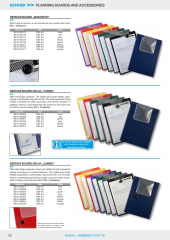12 Hotline: +49(0)9561/2707-42With extra-large capacity. The stable and tough design guarantees a particularly long service life. The wide expansion pleat makes it possible to store log books and service records. In addition, there is a net-reinforced key pocket on the back and a cord for wall mounting. PU = 10 piecesWith extra-large expansion pleat and additional side closure for storing voluminous on-board literature. The stable and tough design guarantees a particularly long service life. On the back there is a net-reinforced foil key pocket, the cord makes it possible to hang up the service board. PU = 10 piecesWith an extra closure of the expansion-pleat pocket to make it easy to insert bulkier documentation.SERVICE BOARD DIN A4 %u201eTURBO%u201c>>SERVICE BOARD DIN A4 %u201eJUMBO%u201c>>Item-No. Size Color9015-00395 DIN A4 blue9015-00396 DIN A4 red9015-00397 DIN A4 green9015-00416 DIN A4 grey9015-00336 DIN A4 yellow9015-00337 DIN A4 blackAll service boards are available with custom colors and individual printing.Item-No. Size Color9015-00557 DIN A4 blue9015-00558 DIN A4 red9015-00559 DIN A4 green9015-00560 DIN A4 grey9015-00565 DIN A4 yellow9015-00568 DIN A4 purple9015-00654 DIN A4 black9015-00706 DIN A4 orangeEICHNER >> PLANNING BOARDS AND ACCESSORIESWith magnet closure, a net-reinforced key pocket and cord.PU = 10 piecesSERVICE BOARD %u201eMAGNETIC%u201c >>Item-No. Size Color9219-00121 DIN A4 blue9219-00140 DIN A4 red9219-00141 DIN A4 grey9219-00134 DIN A4 black9219-00139 DIN A4 green9219-00671 DIN A4 yellow9219-01216 DIN A4 orange9219-01217 DIN A4 purple