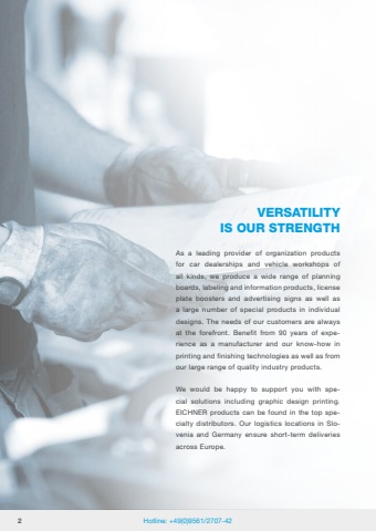 2 Hotline: +49(0)9561/2707-42VERSATILITYIS OUR STRENGTHAs a leading provider of organization products for car dealerships and vehicle workshops of all kinds, we produce a wide range of planning boards, labeling and information products, license plate boosters and advertising signs as well as a large number of special products in individual designs. The needs of our customers are always at the forefront. Benefit from 90 years of experience as a manufacturer and our know-how in printing and finishing technologies as well as from our large range of quality industry products.We would be happy to support you with special solutions including graphic design printing.EICHNER products can be found in the top specialty distributors. Our logistics locations in Slovenia and Germany ensure short-term deliveries across Europe.