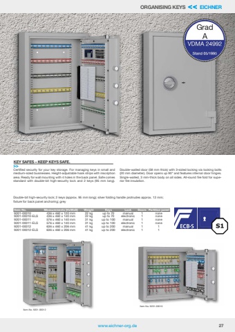 www.eichner-org.de 27Certified security for your key storage. For managing keys in small and medium-sized businesses. Height-adjustable hook strips with inscription area. Ready for wall mounting with 4 holes in the back panel. Safe comes standard with double-bit high-security lock and 2 keys (95 mm long). Double-walled door (58 mm thick) with 3-sided locking via locking bolts (20 mm diameter). Door opens up 90%u00b0 and features internal door hinges. Single-walled, 3 mm-thick body on all sides. All-round fire fold for superior fire insulation.Double-bit high-security lock; 2 keys (approx. 95 mm long); silver folding handle protrudes approx. 12 mm; fixture for back panel anchoring; greyItem-No. 9201-00010Item-No. 9201-00012EN 14450ORGANISING KEYS << EICHNERKEY SAFES %u2013 KEEP KEYS SAFE.>>Item-No. Measurements (HxWxD) Weight Keys Lock Doors Partition panel9201-00010 436 x 460 x 120 mm 22 kg up to 70 manual 1 none9201-00010-ELS 436 x 460 x 140 mm 22 kg up to 70 electronic 1 none9201-00011 576 x 460 x 140 mm 31 kg up to 100 manual 1 none9201-00011-ELS 576 x 460 x 140 mm 31 kg up to 100 electronic 1 none9201-00012 636 x 460 x 206 mm 41 kg up to 200 manual 1 19201-00012-ELS 636 x 460 x 206 mm 41 kg up to 200 electronic 1 1Item-No. 9201-00011