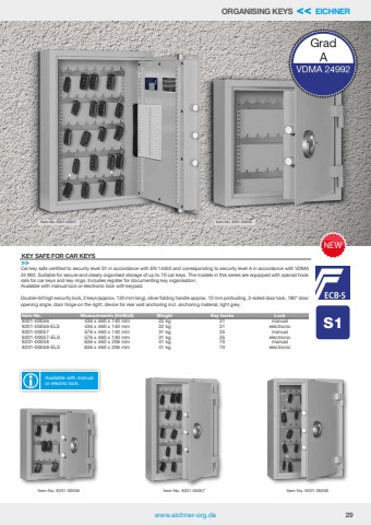 www.eichner-org.de 29ORGANISING KEYS << EICHNERCar key safe certified to security level S1 in accordance with EN 14450 and corresponding to security level A in accordance with VDMA 24 992. Suitable for secure and clearly organised storage of up to 70 car keys. The models in this series are equipped with special hook rails for car keys and key rings. Includes register for documenting key organisation.Available with manual lock or electronic lock with keypad.Double-bit high security lock, 2 keys (approx. 120 mm long), silver folding handle approx. 12 mm protruding, 3-sided door lock, 180%u00b0 door opening angle, door hinge on the right, device for rear wall anchoring incl. anchoring material, light grey.Item-No. 9201-00056 Item-No. 9201-00057 Item-No. 9201-00058KEY SAFE FOR CAR KEYS>>Item-No. Measurements (HxWxD) Weight Key hooks Lock9201-00056 436 x 460 x 140 mm 22 kg 31 manual9201-00056-ELS 436 x 460 x 140 mm 22 kg 31 electronic9201-00057 576 x 460 x 140 mm 31 kg 35 manual9201-00057-ELS 576 x 460 x 140 mm 31 kg 35 electronic9201-00058 636 x 460 x 206 mm 41 kg 70 manual9201-00058-ELS 636 x 460 x 206 mm 41 kg 70 electronicItem-No. 9201-00057 Item-No. 9201-00056S1Available with manual or electric lock.NEW