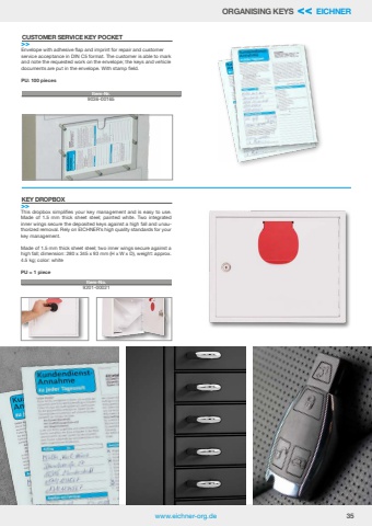 www.eichner-org.de 35This dropbox simplifies your key management and is easy to use. Made of 1.5 mm thick sheet steel; painted white. Two integrated inner wings secure the deposited keys against a high fall and unauthorized removal. Rely on EICHNER%u2019s high quality standards for your key management.Made of 1.5 mm thick sheet steel; two inner wings secure against a high fall; dimension: 280 x 345 x 93 mm (H x W x D), weight: approx. 4.5 kg; color: whitePU = 1 pieceKEY DROPBOX>>CUSTOMER SERVICE KEY POCKET>>Envelope with adhesive flap and imprint for repair and customer service acceptance in DIN C5 format. The customer is able to mark and note the requested work on the envelope; the keys and vehicle documents are put in the envelope. With stamp field.PU: 100 piecesItem-No.9201-00021Item-Nr.9036-00165ORGANISING KEYS << EICHNER