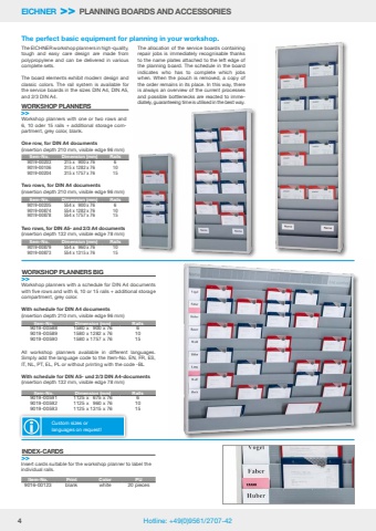 4 Hotline: +49(0)9561/2707-42The perfect basic equipment for planning in your workshop.Workshop planners with one or two rows and 6, 10 oder 15 rails + additional storage compartment, grey color, blank.One row, for DIN A4 documents(insertion depth 210 mm, visible edge 96 mm)Two rows, for DIN A4 documents(insertion depth 210 mm, visible edge 96 mm)Two rows, for DIN A5- and 2/3 A4 documents(insertion depth 132 mm, visible edge 78 mm)The EICHNER workshop planners in high-quality, tough and easy care design are made from polypropylene and can be delivered in various complete sets. The board elements exhibit modern design and classic colors. The rail system is available for the service boards in the sizes DIN A4, DIN A5, and 2/3 DIN A4.The allocation of the service boards containing repair jobs is immediately recognisable thanks to the name plates attached to the left edge of the planning board. The schedule in the board indicates who has to complete which jobs when. When the pouch is removed, a copy of the order remains in its place. In this way, there is always an overview of the current processes and possible bottlenecks are reacted to immediately, guaranteeing time is utilised in the best way.Insert cards suitable for the workshop planner to label the individual rails.EICHNER >> PLANNING BOARDS AND ACCESSORIESWORKSHOP PLANNERS>>INDEX-CARDS>>Item-No. Dimension (mm) Rails9019-00203 315 x 900 x 76 69019-00106 315 x 1282 x 76 109019-00204 315 x 1757 x 76 15Item-No. Dimension (mm) Rails9019-00205 554 x 900 x 76 69019-00874 554 x 1282 x 76 109019-00878 554 x 1757 x 76 15Item-No. Dimension (mm) Rails9019-00879 554 x 960 x 76 109019-00873 554 x 1315 x 76 15Item-No. Print Color PU9016-00123 blank white 20 piecesWorkshop planners with a schedule for DIN A4 documents with five rows and with 6, 10 or 15 rails + additional storage compartment, grey color.With schedule for DIN A4 documents(insertion depth 210 mm, visible edge 96 mm)All workshop planners available in different languages. Simply add the language code to the Item-No. EN, FR, ES, IT, NL, PT, EL, PL or without printing with the code -BLWith schedule for DIN A5- und 2/3 DIN A4-documents(insertion depth 132 mm, visible edge 78 mm)Custom sizes orlanguages on request!WORKSHOP PLANNERS BIG>>Item-No. Dimension (mm) Rails9019-00588 1580 x 900 x 76 69019-00589 1580 x 1282 x 76 109019-00590 1580 x 1757 x 76 15Item-No. Dimension (mm) Rails9019-00591 1125 x 675 x 76 69019-00592 1125 x 960 x 76 109019-00593 1125 x 1315 x 76 15
