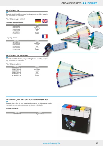 www.eichner-org.de 43ORGANISING KEYS << EICHNERColored, size 210 x 35 mm, easy handling thanks to sliding snap-in clip, inscribable on both sides, colors can be chosen individually.PU = 6x 100 piecesPP KEY TAG %u201eFIX%u201c - SET OF 6 PU%u2019S IN DISPENSER BOX>>Item-No. Color9219-00119 of your choiceColored, size 210 x 35 mm, easy handling thanks to sliding snap-in clip, inscribable on both sides.PU = 100 pieces, pre-printedLanguage German/English PP KEY TAG %u201eFIX%u201c>>Item-No. Color9208-00647 blue9208-00648 light grey9208-00649 violet9208-00635 red9218-00274 yellow9218-00273 greenItem-No. Color9219-00144 blue9219-00142 light grey9219-00330 violet9219-00143 red9219-00205 yellow9219-00329 greenLanguage FrenchColored, size 210 x 35 mm, easy handling thanks to sliding snap-in clip, inscribable on both sidesPU = 100 pieces, blankPP KEY TAG %u201eFIX%u201c NEUTRAL>>Item-No. Color9208-00647-B blue9208-00648-B light grey9208-00649-B violet9208-00635-B red9218-00274-B yellow9218-00273-B green