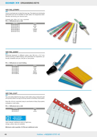 46 Hotline: +49(0)9561/2707-42EICHNER >> ORGANISING KEYSUse an overhead pen to label the loop tag. The labels are individually perforated and can be labelled on both sides. An inexpensive identification aid during your service work.Colored; size: 160 x 12.7 mm; unprintedPU = 1.000 pieces (on a roll)KEY TAG %u201eSTRIPE%u201c>>Item-No. Color9219-00105-N blue9219-00106-N green9219-00107-N red9219-00108-N orange9219-00109-N yellow9219-00110-N whiteYou can easily label the key tag on both sides using a ball-point pen and quickly attach the tag to the key thanks to the Easy-Clip system.Size: 85 x 22 mm; unprinted, easy to use thanks to Easy Clip system; writeable on both sides.PU = 1.000 pieces (on a roll)Upon request, additional colors of light blue, orange, yellow clips are available. Minimum order quantity: 10 PUs per additional colorKEY TAG %u201eCLIP%u201c>>Item-No. Color9219-00146 red9219-00147 whiteExtremely tearproof, in different colors, size 160 mm x 12,7 mm, without printing, endless folding, with perforation for separation, optionally writeable with pen, felt pen or wire printerPU = 1.000 pieces on each foldingKEY TAG %u201eDURA%u201c>>Item-No. Color9219-00813 white9219-00814 blue9219-00815 red9219-00816 green9219-00817 yellow9219-00818 orangeUpon request additional colors are available.