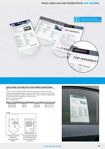 www.eichner-org.de 49PRICE LABELLING AND PRESENTATION << EICHNERPrinted with your individualdesign from 25 pieces onwards.Like price sheet holder standard for window clamping, however with 4cmcustomisable advertising space. Made of shatter-proof and shock-proof polycarbonate, insensitive to light, heat and cold, various sizes and alignments, to insert behind the windscreen or side window.Minimum order: 25 piecesPU = 5 pieces/packItem-No. Size Alignment Dimension (W x L)9219-01001 DIN A4 Portrait 216 x 418 mm9219-01002 DIN A4 Landscape 306 x 327 mm9219-01003 DIN A3 Landscape 426 x 415 mmPRICE SHEET HOLDER WITH CUSTOMISED ADVERTISING>>Lift the transparent foil and place the corresponding sheet behind it.The price-sheet holder can be conventiently clipped behind the windscreen or side windowUsage: