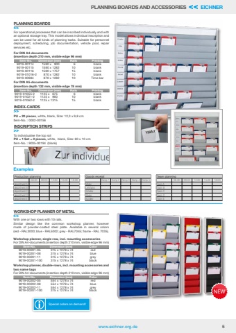 www.eichner-org.de 5For operational processes that can be inscribed individually and with an optional storage tray. This model allows individual inscription and can be used for all kinds of planning tasks. Suitable for personnel deployment, scheduling, job documentation, vehicle pool, repair services etc.For DIN A4-documents (insertion depth 210 mm, visible edge 96 mm)For DIN A5-documents (insertion depth 132 mm, visible edge 78 mm)PU = 20 pieces, white, blank, Size: 12,3 x 9,8 cmItem-No. : 0002-00156To individualise the top railPU = 1 Set = 2 pieces, white, blank, Size: 80 x 10 cmItem-No. : 9035-00194 (blank)Production planning06:00 09:00 12:00 15:00 18:00department Adepartment Bdepartment Cdepartment Ddepartment ETeamplanung06:00 09:00 12:00 15:00 18:00Team ATeam BTeam CTeam DTeam EWith one or two rows with 10 rails.Similar design like the common workshop planner, however made of powder-coated steel plate. Available in several colors (red - RAL3000; blue - RAL5002; grey - RAL7045; frame - RAL 7035).Workshop planner, single row, incl. mounting accessoriesFor DIN A4-documents (insertion depth 210 mm, visible edge 96 mm)Workshop planner, double-rows, incl. mounting accessories and two name tagsFor DIN A4-documents (insertion depth 210 mm, visible edge 96 mm)PLANNING BOARDS AND ACCESSORIES << EICHNERPLANNING BOARDS >>INDEX-CARDS>>INSCRIPTION STRIPS>>Special colors on demand!WORKSHOP PLANNER OF METAL>>ExamplesItem-No. Dimension (mm) Rails Printing9019-00114 1580 x 900 6 blank9019-00115 1580 x 1282 10 blank9019-00116 1580 x 1757 15 blank9019-01016-2 870 x 1282 10 blank9019-00984 870 x 1282 10 Time barItem-No. Dimension (mm) Rails Printing9019-01055-2 1125 x 675 6 blank9019-01021-2 1125 x 960 10 blank9019-01062-2 1125 x 1315 15 blankItem-No. Dimension (mm) Color9019-00201-05 315 x 1278 x 74 red9019-00201-08 315 x 1278 x 74 blue9019-00201-11 315 x 1278 x 74 grey9019-00201-100 315 x 1278 x 74 blackItem-No. Dimension (mm) Color9019-00202-05 554 x 1278 x 74 red9019-00202-08 554 x 1278 x 74 blue9019-00202-11 554 x 1278 x 74 grey9019-00201-100 315 x 1278 x 74 blackGoods receiptRamp 1 Ramp 2 Ramp 3 Ramp 4 Ramp 5M%u00fcllerLehmannSchallerR%u00f6slerBundlerTeam planning06:00 09:00 12:00 15:00 18:00Team ATeam BTeam CTeam DTeam ENEW