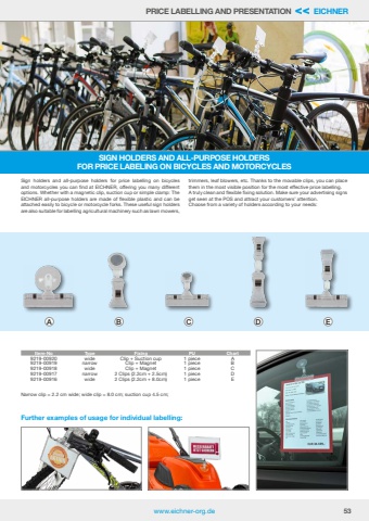 www.eichner-org.de 53PRICE LABELLING AND PRESENTATION << EICHNERSign holders and all-purpose holders for price labelling on bicycles and motorcycles you can find at EICHNER, offering you many different options. Whether with a magnetic clip, suction cup or simple clamp: The EICHNER all-purpose holders are made of flexible plastic and can be attached easily to bicycle or motorcycle forks. These useful sign holders are also suitable for labelling agricultural machinery such as lawn mowers, trimmers, leaf blowers, etc. Thanks to the movable clips, you can place them in the most visible position for the most effective price labelling. A truly clean and flexible fixing solution. Make sure your advertising signs get seen at the POS and attract your customers%u2019 attention. Choose from a variety of holders according to your needs:SIGN HOLDERS AND ALL-PURPOSE HOLDERSFOR PRICE LABELING ON BICYCLES AND MOTORCYCLESNarrow clip = 2.2 cm wide; wide clip = 8.0 cm; suction cup 4.5 cm;Item-No Type Fixing PU Chart 9219-00920 wide Clip + Suction cup 1 piece A9219-00919 narrow Clip + Magnet 1 piece B9219-00918 wide Clip + Magnet 1 piece C9219-00917 narrow 2 Clips (2.2cm + 2.5cm) 1 piece D9219-00916 wide 2 Clips (2.2cm + 8.0cm) 1 piece EA B C D EFurther examples of usage for individual labelling: