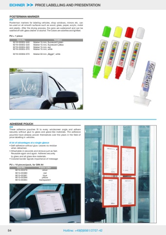 54 Hotline: +49(0)9561/2707-42These adhesive pouches fit to every windscreen angle and adhere securely without glue to glass and glass-like materials. The adhesive pouches have already proven themselves over the years in the field of price labelling in vehicles.A lot of advantages at a single glance%u2022 Self-adhesive without glue. Leaves no residue when detached.%u2022 Attachable in seconds and remove just as fast.Reusable again and again. Adheres securely to glass and all glass-like materials.%u2022 Colored border signals importance of messagePU = 10 pieces/pack, for DIN A4Item-No. Frame color9015-00379 silver9015-00380 red9015-00381 blue9015-00398 yellow9015-00394 transparentADHESIVE POUCH>>EICHNER >> PRICE LABELLING AND PRESENTATIONItem-No. Variation9219-00005-530 Marker 15 mm, fluorescent green9219-00005-540 Marker 15 mm, fluorescent yellow9219-00005-020 Marker 15 mm, red9219-00005-070 Marker 15 mm, white9219-00006-070 Marker 50 mm %u201eBiggie%u201c, whitePosterman markers for labeling vehicles, shop windows, mirrors etc. can be used on all smooth surfaces such as wood, glass, paper, acrylic, metal and plastic. After the drying process, the pens are waterproof and can be washed off with glass cleaner or alcohol. The Colors are odorless and lightfast.PU = 1 piecePOSTERMAN-MARKER >>
