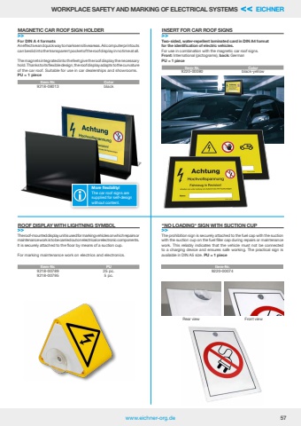 www.eichner-org.de 57WORKPLACE SAFETY AND MARKING OF ELECTRICAL SYSTEMS << EICHNERItem-Nr. PU9218-00789 25 pc.9218-00795 5 pc.Item-Nr. Color9218-08013 blackItem-Nr. Color9220-00080 black-yellowThe roof-mounted display unit is used for marking vehicles on which repairs or maintenance work is to be carried out on electrical or electronic components. It is securely attached to the floor by means of a suction cup.For marking maintenance work on electrics and electronics.The prohibition sign is securely attached to the fuel cap with the suction with the suction cup on the fuel filler cap during repairs or maintenance work. This reliably indicates that the vehicle must not be connected to a charging device and ensures safe working. The practical sign is available in DIN A5 size. PU = 1 pieceROOF DISPLAY WITH LIGHTNING SYMBOL>>%u201cNO LOADING%u201c SIGN WITH SUCTION CUP>>Item-Nr.9220-00074For DIN A 4 formatsAn effective and quick way to mark sensitive areas. A4 computer printouts can be slid into the transparent pocket of the roof display in no time at all. The magnets integrated into the feet give the roof display the necessary hold. Thanks to its flexible design, the roof display adapts to the curvature of the car roof. Suitable for use in car dealerships and showrooms. PU = 1 pieceMAGNETIC CAR ROOF SIGN HOLDER >>INSERT FOR CAR ROOF SIGNS >>Two-sided, water-repellent laminated card in DIN A4 format for the identification of electric vehicles.For use in combination with the magnetic car roof signs.Front: International (pictograms), back: GermanPU = 1 pieceRear view Front viewMore flexibility!The car roof signs are supplied for self-design without content.