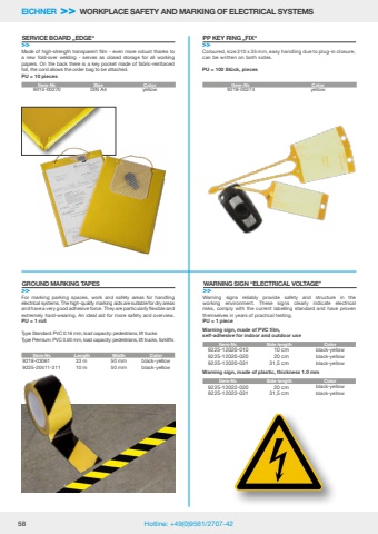 58 Hotline: +49(0)9561/2707-42Item-Nr. Size Color9015-00270 DIN A4 yellowItem-Nr. Color9218-00274 yellowItem-Nr. Length Width Color9218-03061 33 m 50 mm black-yellow9225-20411-311 10 m 50 mm black-yellow Made of high-strength transparent film - even more robust thanks to a new fold-over welding - serves as closed storage for all working papers. On the back there is a key pocket made of fabric-reinforced foil, the cord allows the order bag to be attached.PU = 10 piecesSERVICE BOARD %u201eEDGE%u201c>>Item-Nr. Side length Color9225-12020-010 10 cm black-yellow9225-12020-020 20 cm black-yellow9225-12020-031 31,5 cm black-yellowItem-Nr. Side length Color9225-12022-020 20 cm black-yellow9225-12022-031 31,5 cm black-yellowColoured, size 210 x 35 mm, easy handling due to plug-in closure, can be written on both sides.PU = 100 St%u00fcck, piecesPP KEY RING %u201eFIX%u201c>>WARNING SIGN %u201cELECTRICAL VOLTAGE%u201d >>Warning signs reliably provide safety and structure in the working environment. These signs clearly indicate electrical risks, comply with the current labelling standard and have proven themselves in years of practical testing. PU = 1 pieceWarning sign, made of PVC film, self-adhesive for indoor and outdoor useWarning sign, made of plastic, thickness 1.0 mmGROUND MARKING TAPES>>For marking parking spaces, work and safety areas for handling electrical systems. The high-quality marking aids are suitable for dry areas and have a very good adhesive force. They are particularly flexible and extremely hard-wearing. An ideal aid for more safety and overview. PU = 1 rollType Standard: PVC 0.16 mm, load capacity: pedestrians, lift trucksType Premium: PVC 0.50 mm, load capacity: pedestrians, lift trucks, forkliftsEICHNER >> WORKPLACE SAFETY AND MARKING OF ELECTRICAL SYSTEMS