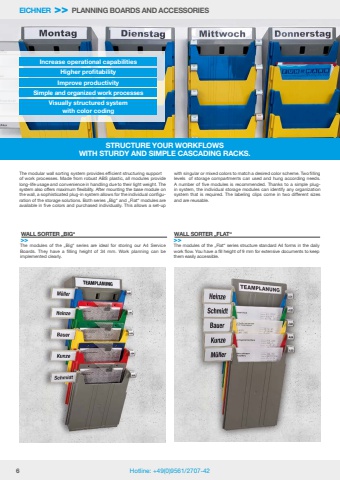 6 Hotline: +49(0)9561/2707-42Increase operational capabilitiesHigher profitabilityImprove productivitySimple and organized work processesVisually structured systemwith color codingWALL SORTER %u201eBIG%u201c>>WALL SORTER %u201eFLAT%u201c>>The modules of the %u201eBig%u201c series are ideal for storing our A4 Service Boards. They have a filling height of 34 mm. Work planning can be implemented clearly.The modules of the %u201eFlat%u201c series structure standard A4 forms in the daily work flow. You have a fill height of 9 mm for extensive documents to keep them easily accessible.STRUCTURE YOUR WORKFLOWSWITH STURDY AND SIMPLE CASCADING RACKS.The modular wall sorting system provides efficient structuring supportof work processes. Made from robust ABS plastic, all modules provide long-life usage and convenience in handling due to their light weight. The system also offers maximum flexibility. After mounting the base module on the wall, a sophisticated plug-in system allows for the individual configuration of the storage solutions. Both series %u201eBig%u201c and %u201eFlat%u201c modules are available in five colors and purchased individually. This allows a set-up with singular or mixed colors to match a desired color scheme. Two filling levels of storage compartments can used and hung according needs. A number of five modules is recommended. Thanks to a simple plugin system, the individual storage modules can identify any organization system that is required. The labeling clips come in two different sizes and are reusable.EICHNER >> PLANNING BOARDS AND ACCESSORIES