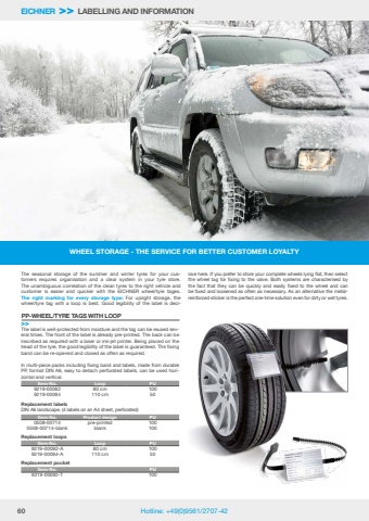 60 Hotline: +49(0)9561/2707-42EICHNER >> LABELLING AND INFORMATIONThe seasonal storage of the summer and winter tyres for your customers requires organisation and a clear system in your tyre store. The unambiguous correlation of the clean tyres to the right vehicle and customer is easier and quicker with the EICHNER wheel/tyre tages. The right marking for every storage type: For upright storage, the wheel/tyre tag with a loop is best. Good legibility of the label is decisive here. If you prefer to store your complete wheels lying flat, then select the wheel tag for fixing to the valve. Both systems are characterised by the fact that they can be quickly and easily fixed to the wheel and can be fixed and loosened as often as necessary. As an alternative the metalreinforced sticker is the perfect one-time solution even for dirty or wet tyres.The label is well-protected from moisture and the tag can be reused several times. The front of the label is already pre-printed. The back can be inscribed as required with a laser or ink-jet printer. Being placed on the tread of the tyre, the good legibility of the label is guaranteed. The fixing band can be re-opened and closed as often as required.In multi-piece packs including fixing band and labels, made from durable PP, format DIN A6, easy to detach perforated labels, can be used horizontal and vertical.Item-No. Loop PU9219-00092 80 cm 1009219-00094 110 cm 50Item-No. PU9219-00092-T 100Item-No. Product design PU0508-00714 pre-printed 1000508-00714-blank blank 100Replacement loopsItem-No. Loop PU9219-00092-A 80 cm 1009219-00094-A 110 cm 50Replacement pocketReplacement labelsDIN A6 landscape, (4 labels on an A4 sheet, perforated)PP-WHEEL/TYRE TAGS WITH LOOP>>WHEEL STORAGE - THE SERVICE FOR BETTER CUSTOMER LOYALTY