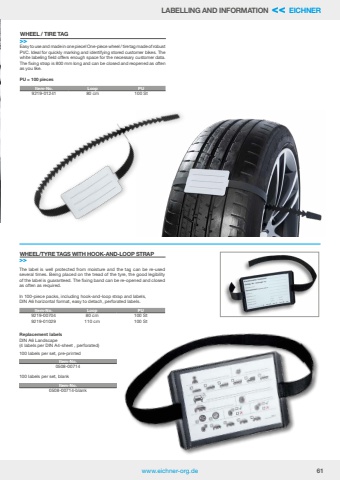 www.eichner-org.de 61The label is well protected from moisture and the tag can be re-used several times. Being placed on the tread of the tyre, the good legibility of the label is guaranteed. The fixing band can be re-opened and closed as often as required.In 100-piece packs, including hook-and-loop strap and labels,DIN A6 horizontal format, easy to detach, perforated labels.Replacement labelsDIN A6 Landscape(4 labels per DIN A4-sheet , perforated)100 labels per set, pre-printed100 labels per set, blankLABELLING AND INFORMATION << EICHNERWHEEL/TYRE TAGS WITH HOOK-AND-LOOP STRAP>>Item-No. Loop PU9219-00704 80 cm 100 St9219-01029 110 cm 100 StItem-No.0508-00714Item-No.0508-00714-blankEasy to use and made in one piece! One-piece wheel / tire tag made of robust PVC. Ideal for quickly marking and identifying stored customer bikes. The white labeling field offers enough space for the necessary customer data. The fixing strap is 800 mm long and can be closed and reopened as often as you like.PU = 100 piecesItem-No. Loop PU9219-01241 80 cm 100 StWHEEL / TIRE TAG >>