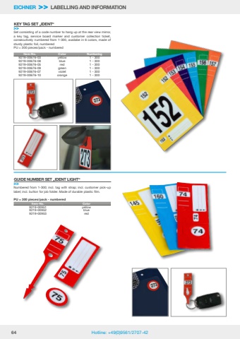 64 Hotline: +49(0)9561/2707-42Set consisting of a code number to hang up at the rear view mirror, a key tag, service board marker and customer collection ticket, consecutively numbered from 1-300, availabe in 6 colors, made of sturdy plastic foil, numberedPU = 300 pieces/pack - numberedNumbered from 1-300; incl. tag with strap; incl. customer pick-up label; incl. button for job folder. Made of durable plastic film.PU = 300 pieces/pack - numberedKEY TAG SET %u201eIDENT%u201c>>GUIDE NUMBER SET %u201eIDENT LIGHT%u201c>>Item-No. Color Numbering9219-00676-03 yellow 1 - 3009219-00676-08 blue 1 - 3009219-00676-05 red 1 - 3009219-00676-09 green 1 - 3009219-00676-07 violet 1 - 3009219-00676-10 orange 1 - 300Item-No. Color9219-00951 yellow9219-00952 blue9219-00953 redEICHNER >> LABELLING AND INFORMATION