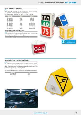 www.eichner-org.de 65The roof sign serves to identify vehicles in which repairs or maintenance work are to be effected on the electrical or electronic components. It also warns from dangerous voltage. The suction cup on the bottom ensures the sign is securely fixed. For identifiying maintenance work on the electrics and electronics.ROOF SIGN WITH LIGHTNING SYMBOL>>Item-No. PU9218-00789 25 St.9218-00795 5 St.Stackable, with magnetic or with suction cup for secure stand, in 5 colors, 25 pieces per set in various numbering:#1 - #25 = A; #26 - #50 = B; #51 - #75 = C; #76 - #100 = DROOF SIGN WITH NUMBER>>ROOF SIGN WITH PRINT %u201eGAS%u201c>>9218-00790 blue suction cup9218-00791 red suction cup9218-00792 green suction cup9218-00793 yellow suction cup9218-00794 black suction cupItem-No. Color Fixing 9218-00226 blue magnet9218-00227 red magnet9218-00228 green magnet9218-00229 yellow magnet9218-00236 black magnetItem-No. Color9218-02019 redRoof sign mounted with magnetic bottom to mark vehicles with liquefied petroleum gas drives. PU = 1 pieceLABELLING AND INFORMATION << EICHNERAlso available with suction cup