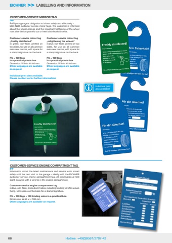 66 Hotline: +49(0)9561/2707-42EICHNER >> LABELLING AND INFORMATIONInformation about the latest maintenance and service work stored safely until the next visit to the garage - ideally with the EICHNER customer service engine compartment tag. All information at first sight, secured with a wire tie in the engine compartment.Customer-service engine compartment tagin blue, non-fade, printed on 2 sides, including binding wire for secure fixing, with space on the back for a stamp/signature.PU = 100 tags + 100 binding wires in a practical box. Dimension: W 65 x H 100 mmOther languages are available on request.CUSTOMER-SERVICE ENGINE COMPARTMENT TAG>>Customer-service mirror tag%u201efreshly disinfected%u201cin green, non-fade, printed on two sides, for use on all common rear-view mirrors, with space for a stamp/signature on the back.PU = 100 tags in a practical plastic boxDimension: W 90 x H 180 mmOther languages are available on request. Customer-service mirror tag%u201eretightening the wheels%u201cin blue, non-fade, printed on two sides, for use on all common rear-view mirrors, with space for a stamp/signature on the back.PU = 100 tags in a practical plastic boxDimension: W 90 x H 180 mmOther languages are available on request. Fulfil your garage%u2018s obligation to inform safely and effectively - EICHNER customer service mirror tags. The customer is informed about the wheel change and the important tightening of the wheel nuts after 50 km pointed out or fresh disinfected interior.CUSTOMER-SERVICE MIRROR TAG>>Individual print also available. Please contact us for further information!Individual print also available!
