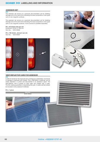 68 Hotline: +49(0)9561/2707-42EICHNER >> LABELLING AND INFORMATIONASSESSOR-SET>>DENT-REFLECTOR CARD FOR ASSESSOR>>The assessor set serves as a practical documentation aid for labelling damage and at the same time indicating the exact proportions. Even grips well on non-magnetic surfaces. The assessor set serves as a practical documentation aid for labelling damage and at the same time indicating the exact proportions. Even grips well on non-magnetic surfaces. A set of arrows is available separately.PU = 50 sticker-sets per roll.Dimension: W 60 x H 160 mmItem-No.: 9220-00062PU = 100 sticker %u201eArrows%u201c per roll.Item-No.: 9220-00067In DIN A4 format for the improved and unambiguous presentation of all kinds of damage to paintwork and chassis. Thus, small dents in particular can be clearly depicted in a photo and documented in an assessor%u2018s report. The dent-reflector card is printed on both sides and marked with a scale. The film coating guarantees a long-lasting life cycle. A useful aid that should be included in every assessor%u2018s briefcase.PU = 1 pieceItem-No.9220-00063