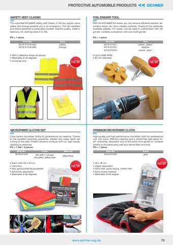 www.eichner-org.de 73PROTECTIVE AUTOMOBILE PRODUCTS << EICHNERItem-No. Color9219-01416-040 yellow9219-01416-060 orangeItem-No. Tool9219-01421 rubber %u201eWave%u201c9219-01422 adapter9219-01423 rubber %u201eDisc%u201cSAFETY VEST CLASSIC>>FOIL ERASER TOOL>>The unprinted EICHNER safety vest Classic in the two signal colors yellow and orange protects you in an emergency. The dirt-repellent and stable polyester is particularly durable. Highest quality, made in Germany, for clothing sizes S to XXL.PU = 1 pieceWith the EICHNER foil eraser you can remove adhesive residue, decorative strips, etc. from metallic surfaces. Thanks to the optionally available adapter, the eraser can be used in combination with die grinder, cordless screwdriver, drill and multi-grinder.PU = 1 pieceMICROFIBER CLOTHS SET>>Color-sorted microfiber cloths for professional car cleaning. Thanks to the excellent polishing properties, streaks and water spots are a thing of the past. Protect sensitive surfaces with our high-quality cleaning accessories.PU = 1 Set / 4 pieces%u2022 Each cloth 40 x 40 cm%u2022 Ultra-fine%u2022 Very good polishing properties%u2022 Extremely absorbent%u2022 Washable at 60 degrees%u2022 With 2 reflective strips all around%u2022 Washable at 40 degrees%u2022 Universal size%u2022 Up to 4000 RPM%u2022 90 mm diameter%u2022 40 x 40 cm%u2022 Highly absorbent%u2022 Extra soft, quick-drying, streak-free%u2022 Extra sturdy material%u2022 Washable at 60 degreeItem-No. Color Material9219-01419 Set with 4 colours,red, green, yellow, blue MikrofibrePREMIUM MICROFIBER CLOTH>>High-quality and high-performance microfiber cloth for professional use. For quick, effective cleaning and a streak-free high-gloss finish. Extremely absorbent and at the same time gentle on surfaces thanks to the particularly soft and dense fiber structure.PU = 1 pieceItem-No. Color9219-01420 greyNEWNEWNEWNEW