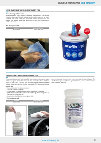 www.eichner-org.de 75HYGIENE PRODUCTS << EICHNERThe practical dispenser box holds 200 disinfectant and cleaning wipes to hand for quick disinfection on all alcohol-resistant surfaces. With the cloths in size 215 x 215 mm, you can clean streak-free and odorless without bleach and do not need to wipe again. The dispenser box can be reused several times with the environmentally friendly refill pack. The disinfectant wipes are effective against bacteria, viruses (HBV / HIV) and fungi (Candida albicans).DISINFECTANT WIPES IN DISPENSER TUB>>How to use:%u2022 Remove the lid of the dispenser box%u2022 Cut open the top of the bag%u2022 Put the bag in the dispenser box, leave the tissues in the bag%u2022 Pull the first cloth from the center of the roll through the opening in the lid%u2022 Then put the cover back on%u2022 Always close the lid after removing the clothPU = 1 dispenser tubItem-Nr. Cloth dimension9127-01819 215 x 215 mmHand cleaning without water.Abrasive cleaning cloths soaked in a special soap solution. They enable effective cleaning of heavily soiled hands, tools, machines or work surfaces. The wipes safely and thoroughly remove stubborn dirt and grease. The soaked wipes are gentle on the skin and moisturising. 1 Tub = 72 wipes.PU = 1 dispenser tubHAND CLEANING WIPES IN DISPENSER TUB>>Item-Nr. Cloth dimension9127-02039 260 x 300 mmNEW