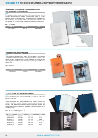 76 Hotline: +49(0)9561/2707-42EICHNER >> TENDER DOCUMENT AND PRESENTATION FOLDERSItem-No. Dimension Thickness Color 9038-00739 DIN A4 0,45 mm blue9038-00740 DIN A4 0,45 mm black9038-00741 DIN A4 0,45 mm white9038-00742 DIN A4 0,45 mm transparent9038-00743 DIN A3 0,60 mm black9038-00744 DIN A3 0,60 mm blueItem-No. Dimension Color9218-00871 DIN A4 transparentItem-No. Dimension Color9700-00001 DIN A4 transparentPP TENDER DOCUMENT AND PRESENTATION FOLDER WITH TAB CLOSURE>>TENDER DOCUMENT FOLDER>>FLAP FOLDER WITH ELASTIC BANDS>>The durable tender document folder with business card slots is made of environmentally friendly polypropylene. Ideal for project documentation, tender document presentations, etc. Includes eyelets for filing in ring binders or files. The integrated side flaps and the fastener on the front cover prevent documents from falling out.PU = 15 piecesThis flexible tender document folder with transparent outer pocket is ideal for professional storage of your documents. Filing in a ring binder or file is possible thanks to the integrated filing mechanism. The integrated side flaps protect the documents against dirt, creases and loss.PU = 5 piecesComes in different sizes and colors for DIN A4 or DIN A3, with elastic bands on corners.These flap folders with elastic bands on the corners are the right choice if you want to safely store and transport plans, files and brochures. They are environmentally friendly, extremely durable and safely hold everything together. Available in different colors for A4 and A3 formats.PU = 10 pieces A4 / 5 pieces A3