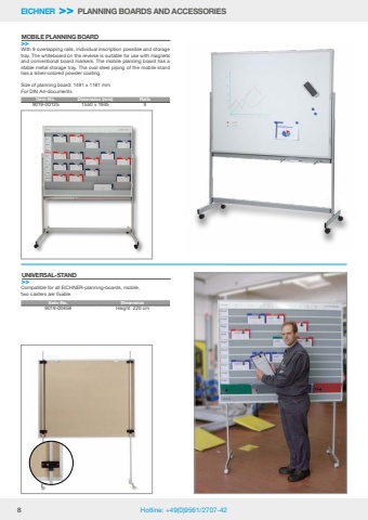 8 Hotline: +49(0)9561/2707-42With 9 overlapping rails, individual inscription possible and storage tray. The whiteboard on the reverse is suitable for use with magnets and conventional board markers. The mobile planning board has a stable metal storage tray. The oval steel piping of the mobile stand has a silver-colored powder coating.Size of planning board: 1491 x 1181 mmFor DIN A4-documentsCompatible for all EICHNER-planning-boards, mobile, two casters are fixableMOBILE PLANNING BOARD>>UNIVERSAL-STAND>>Item-No. Dimension (mm) Rails9019-00125 1550 x 1945 9Item-No. Dimension9019-00858 Height: 220 cmEICHNER >> PLANNING BOARDS AND ACCESSORIES