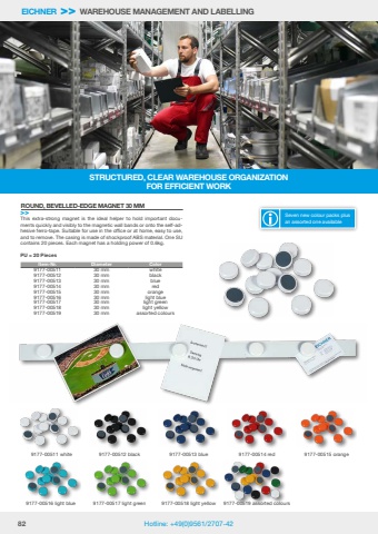 82 Hotline: +49(0)9561/2707-42EICHNER >> WAREHOUSE MANAGEMENT AND LABELLINGThis extra-strong magnet is the ideal helper to hold important documents quickly and visibly to the magnetic wall bands or onto the self-adhesive ferro-tape. Suitable for use in the office or at home, easy to use, and to remove. The casing is made of shockproof ABS material. One SU contains 20 pieces. Each magnet has a holding power of 0.6kg.PU = 20 PiecesROUND, BEVELLED-EDGE MAGNET 30 MM>>Item-Nr. Diameter Color9177-00511 30 mm white9177-00512 30 mm black9177-00513 30 mm blue9177-00514 30 mm red9177-00515 30 mm orange9177-00516 30 mm light blue9177-00517 30 mm light green9177-00518 30 mm light yellow9177-00519 30 mm assorted colours9177-00511 white9177-00516 light blue9177-00512 black9177-00517 light green9177-00513 blue9177-00518 light yellow9177-00514 red9177-00519 assorted colours9177-00515 orangeSeven new colour packs plus an assorted one availableSTRUCTURED, CLEAR WAREHOUSE ORGANIZATIONFOR EFFICIENT WORK