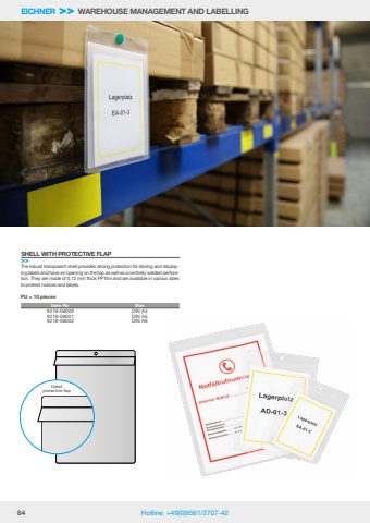 84 Hotline: +49(0)9561/2707-42EICHNER >> WAREHOUSE MANAGEMENT AND LABELLINGDetail protective flapItem-Nr. Size9218-06000 DIN A49218-06001 DIN A59218-06002 DIN A6The robust transparent shell provides strong protection for storing and displaying labels and have an opening on the top as well as a centrally welded perforation. They are made of 0,12 mm thick PP film and are available in various sizes to protect notices and labels.PU = 10 piecesSHELL WITH PROTECTIVE FLAP>>