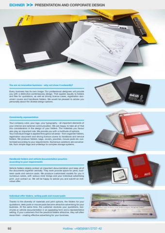 92 Hotline: +49(0)9561/2707-42EICHNER >> PRESENTATION AND CORPORATE DESIGNVehicle folders reliably protect all important documentation and keep all of the documents together centrally. They even provide space for pens, business cards and service cards. We produce customised models for you in numerous colors, with various inner linings and your individual advertising print. Just contact us. We will be happy to advise you and submit an individual offer.Handbook folders and vehicle documentation pouches according to your requirementsYou are an innovative business - why not show it outwardly?Consistently representativeEvery business has its own image. Our professional designers will provide you with a distinctive contemporary design. That applies equally to folders and files for quotations, as well as driving licence cases, registration document covers and handbook folders. We would be pleased to advise you personally about the diverse design options.Your company color, your logo, your typography - all important elements of your internal and external communication. We are happy to take all of that into consideration in the design of your folders. The materials you favour also play an important role. We provide you with a multitude of options. Your individual image is applied throughout all areas - from organiser folders, registration document and driving licence covers to handbook and service folders. We produce folders, bags, covers, pouches, mouse pads etc customised according to your requirements. Numerous variations are conceivable, from simple bags and underlays to complex storage systems.Thanks to the diversity of materials and print options, the folders for your quotations, desk pads or mouse pads become attractive advertising for your business. At the same time, the customer receives your quotations, brochures or vehicle documentation in an appealing form and a representative setting. If your customers find the practical folders attractive, they will often reuse them - creating effective advertising for your business.Individual offer folders, writing pads and mouse pads