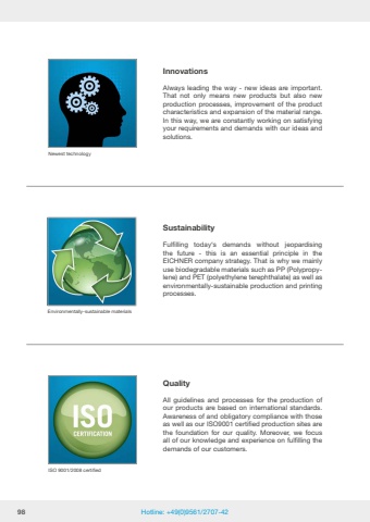 98 Hotline: +49(0)9561/2707-42InnovationsAlways leading the way - new ideas are important. That not only means new products but also new production processes, improvement of the product characteristics and expansion of the material range. In this way, we are constantly working on satisfying your requirements and demands with our ideas and solutions.Newest technologyEnvironmentally-sustainable materialsISO 9001/2008 certifiedSustainabilityFulfilling today%u2018s demands without jeopardising the future - this is an essential principle in the EICHNER company strategy. That is why we mainly use biodegradable materials such as PP (Polypropylene) and PET (polyethylene terephthalate) as well as environmentally-sustainable production and printing processes.QualityAll guidelines and processes for the production of our products are based on international standards. Awareness of and obligatory compliance with those as well as our ISO9001 certified production sites are the foundation for our quality. Moreover, we focus all of our knowledge and experience on fulfilling the demands of our customers.
