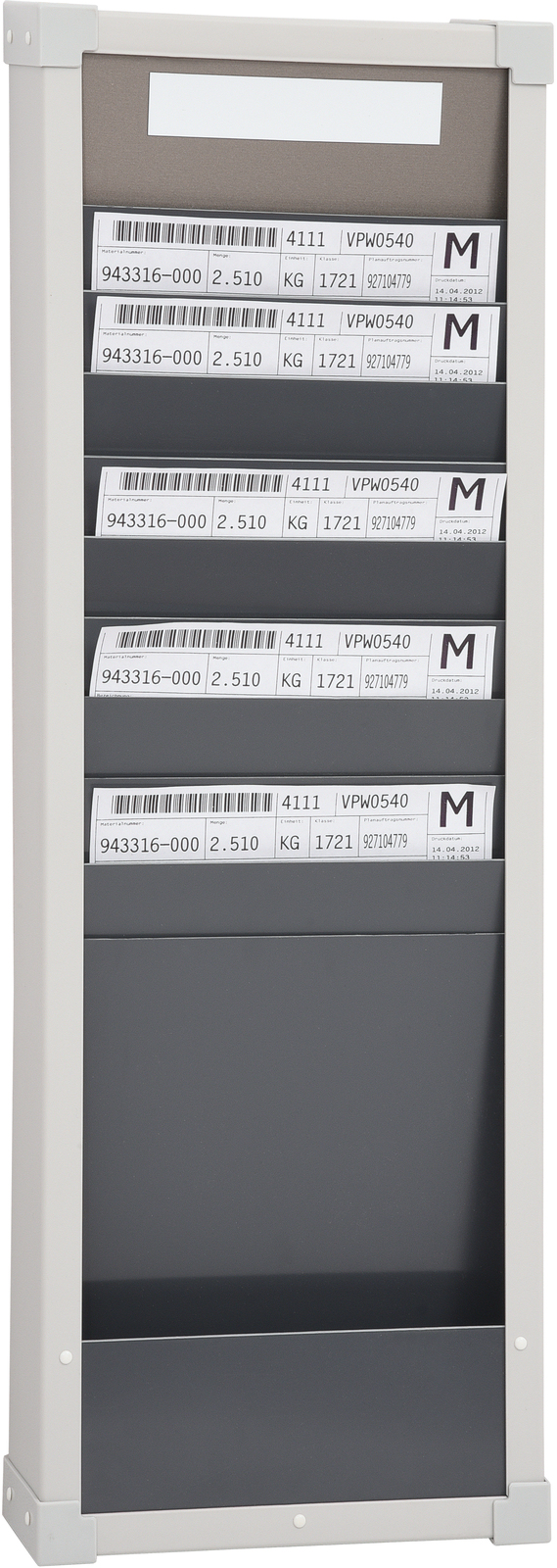 The card board is available with 1, 2 and 3 columns as well as 10 or 25 insert slots for DIN A4 vertical-slips. The visible border off the receipt amounts to 40mm and thus enables quick identification. The two and three-column segments have separating bars, the depth of the individual slots is 6mm. The optional index segment serves to simplify the planning according to weekdays, personnel or production. The boards can be combined as required. Each board has the corresponding magnetic tags for labelling. The tags can also be ordered separately. The board can also be quickly and easily mounted onto a wall using a wall-mount profile rail.