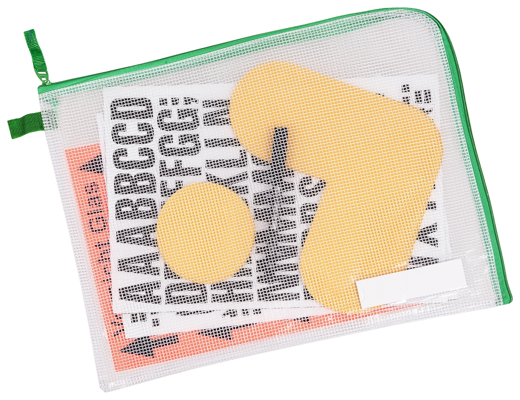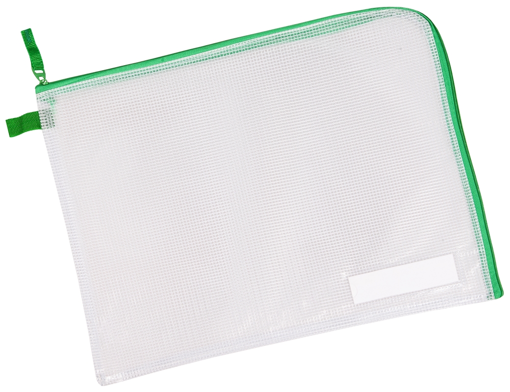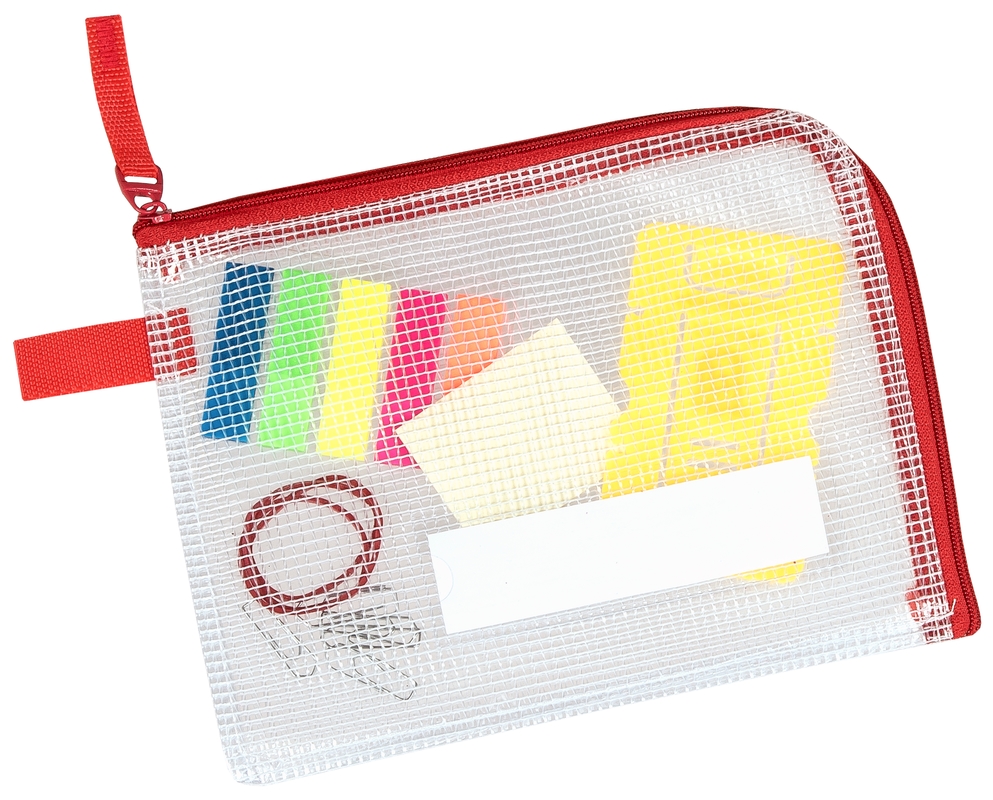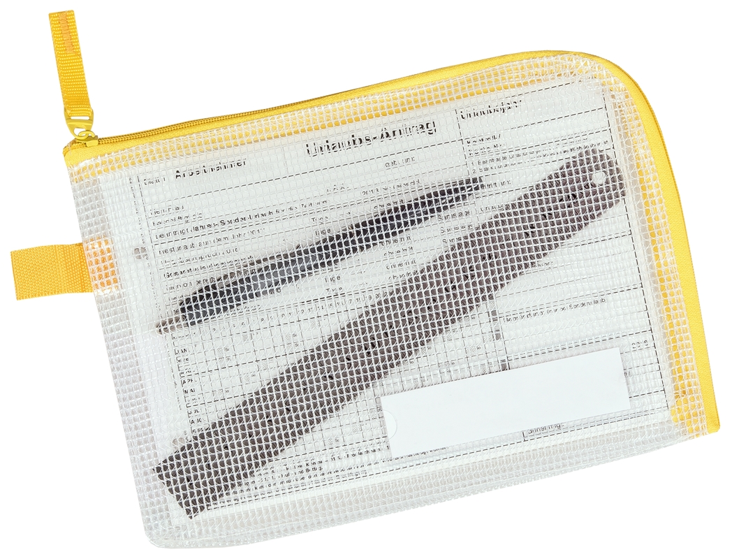 Consumable bag from nylon-reinforced pvc for a sure storage of small parts and documents. The semicircle and colored zipper alleviates the filling as well as the removal. The welded transparent film is for the intake of an individual insertion tag.
