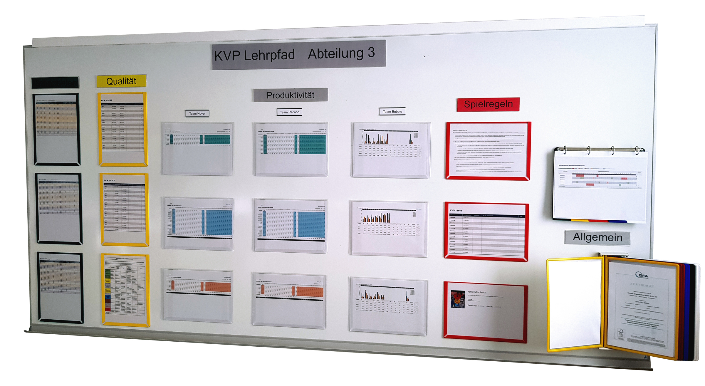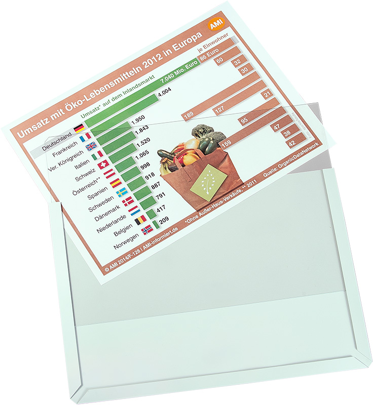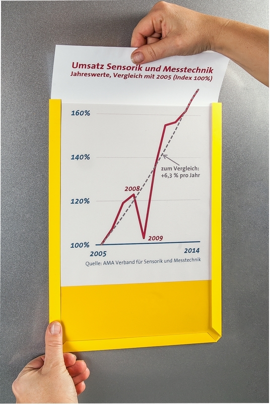 Transparent magnetic pouch made of rigid PVC, bevelled on three sides, strong magnetic strips on the back, various colours available in DIN A4 vertical + horizontal.