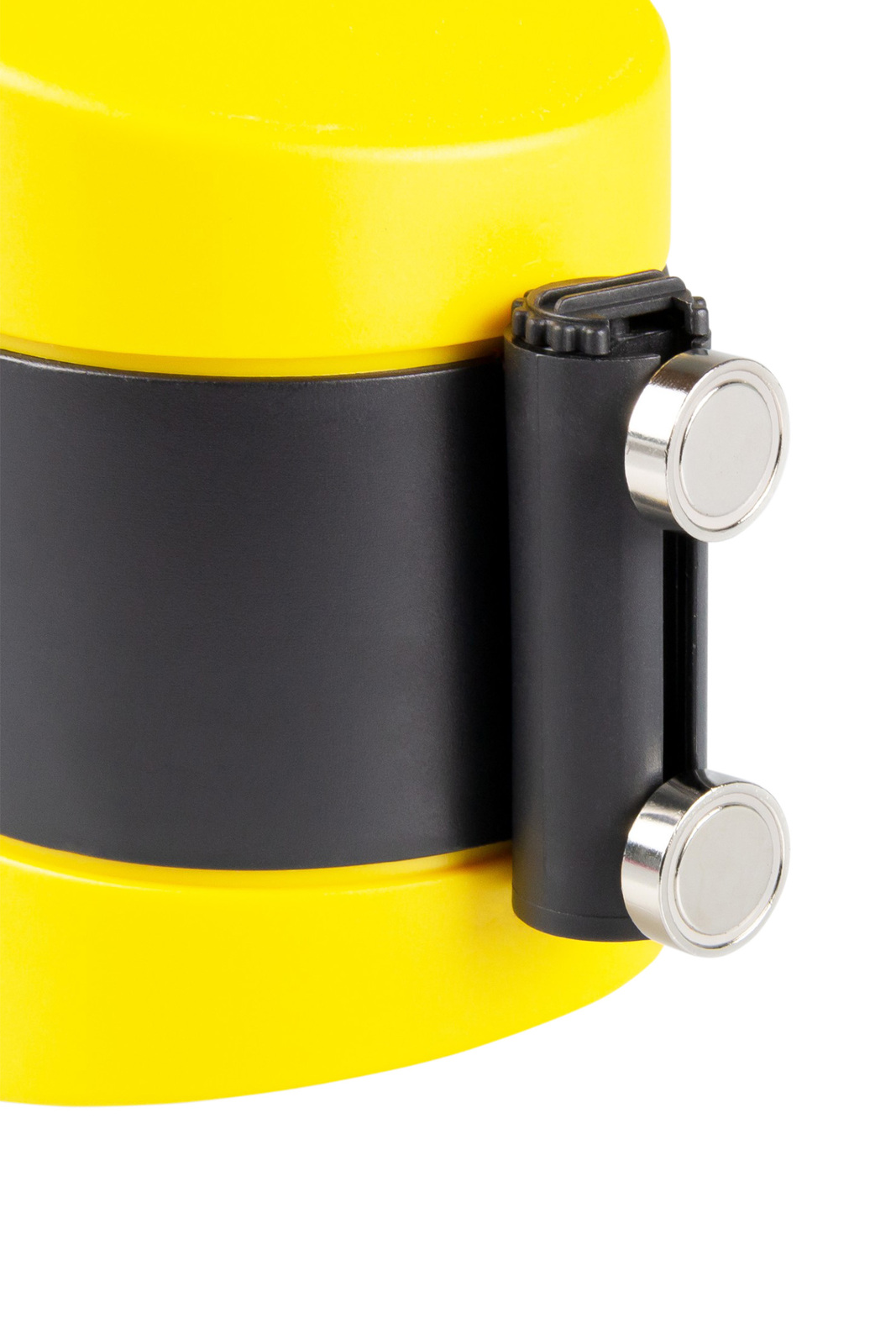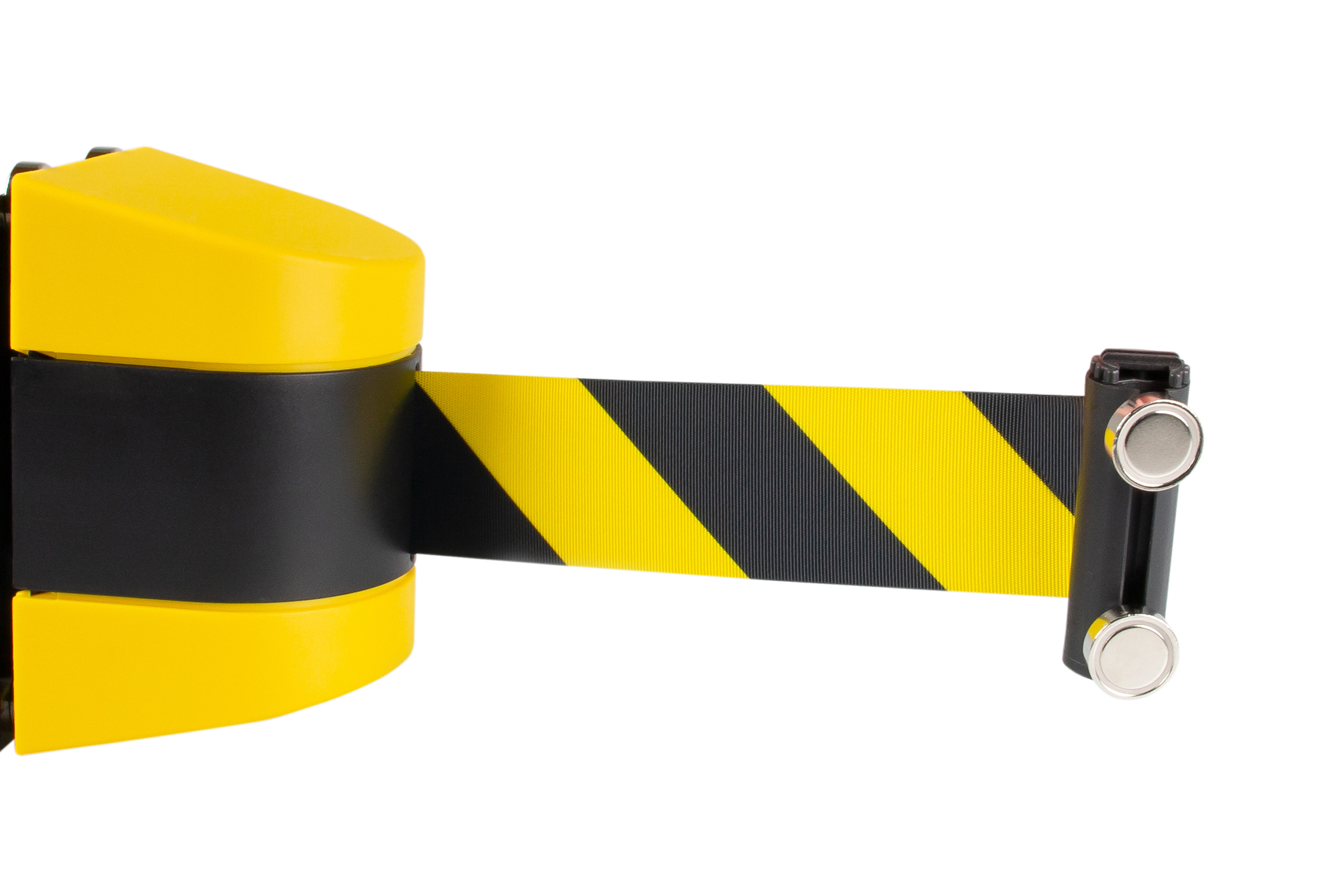 The magnetic barrier tape is the ideal solution for temporarily securing hazardous and work areas in warehouses and industrial facilities. Thanks to its strong magnetic attachment, it can be flexibly attached to metallic surfaces without the need for tools – for maximum mobility and efficiency. Featuring a durable, highly visible webbing, it guarantees a clear signal and high durability in daily use. The integrated, patented centrifugal brake prevents the tape from suddenly recoiling and enables controlled and safe retraction – for greater safety and convenience during handling.