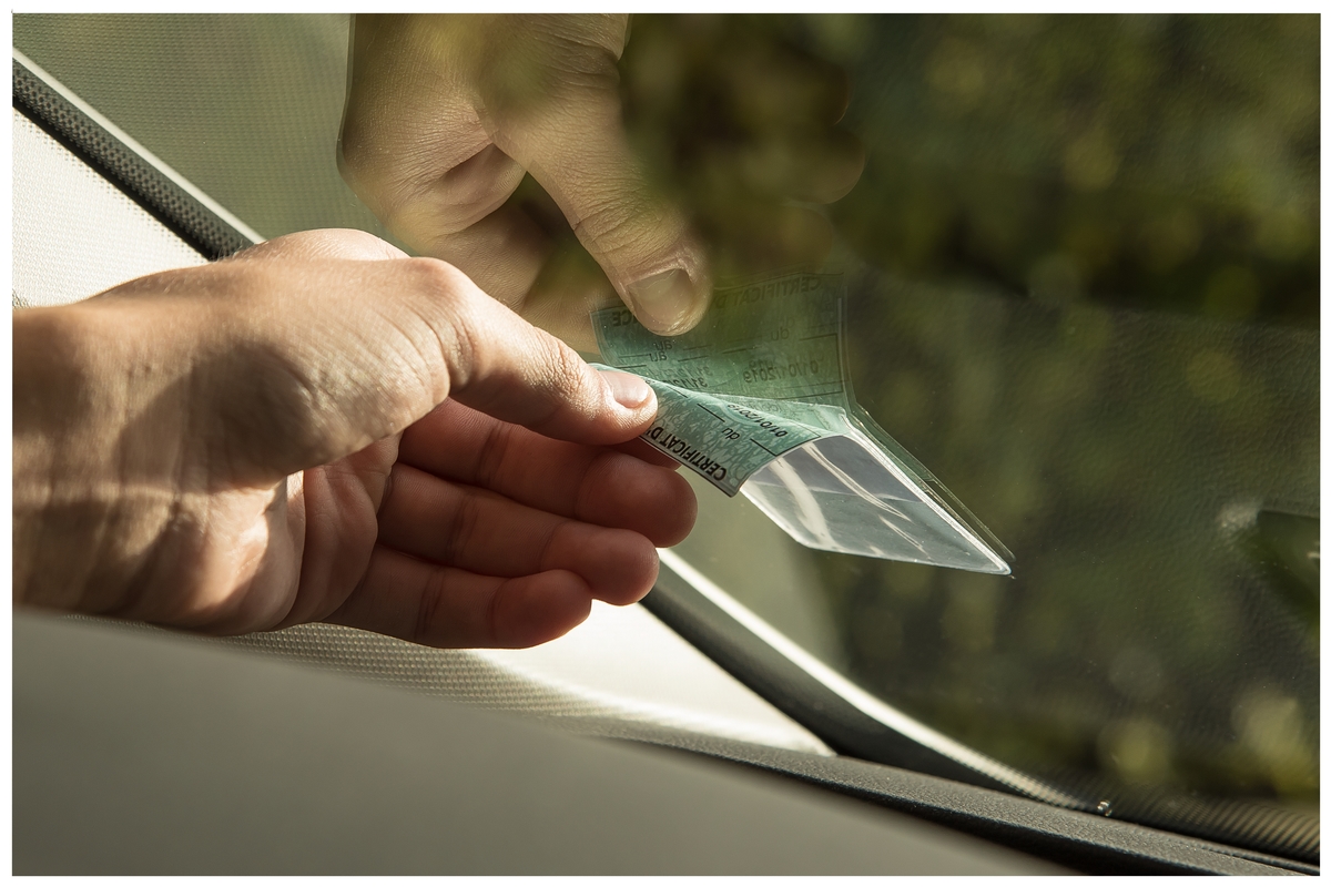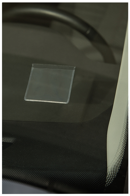 Self-adhesive pouch for windshields to present identification and insurance cards, easy to install and sleek finish allows for unrestricted view and presenting info.