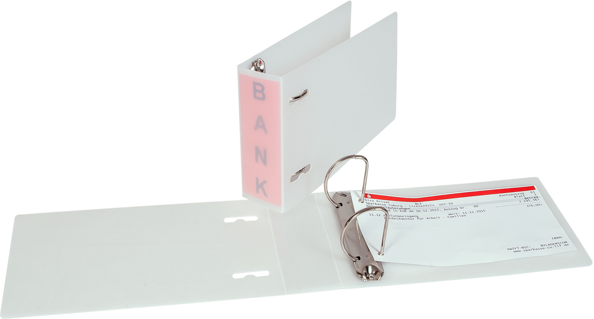 Diese Kontoauszugsordner aus PP sind für Auszüge bis zu einem Format von 210 x 140 mm geeignet. Durch die innenliegender Rückentasche kann dieser Ordner Banken individualisiert werden. Sie beinhaltet eine 2-Ring-Combi Mechanik und ist durch die 1,6 mm PP-Folie äußerst strapazierfähig. Wahlweise als kleine Variante für 1 Kontoauszug oder als große Variante für 2 Kontoauszüge untereinander geeignet