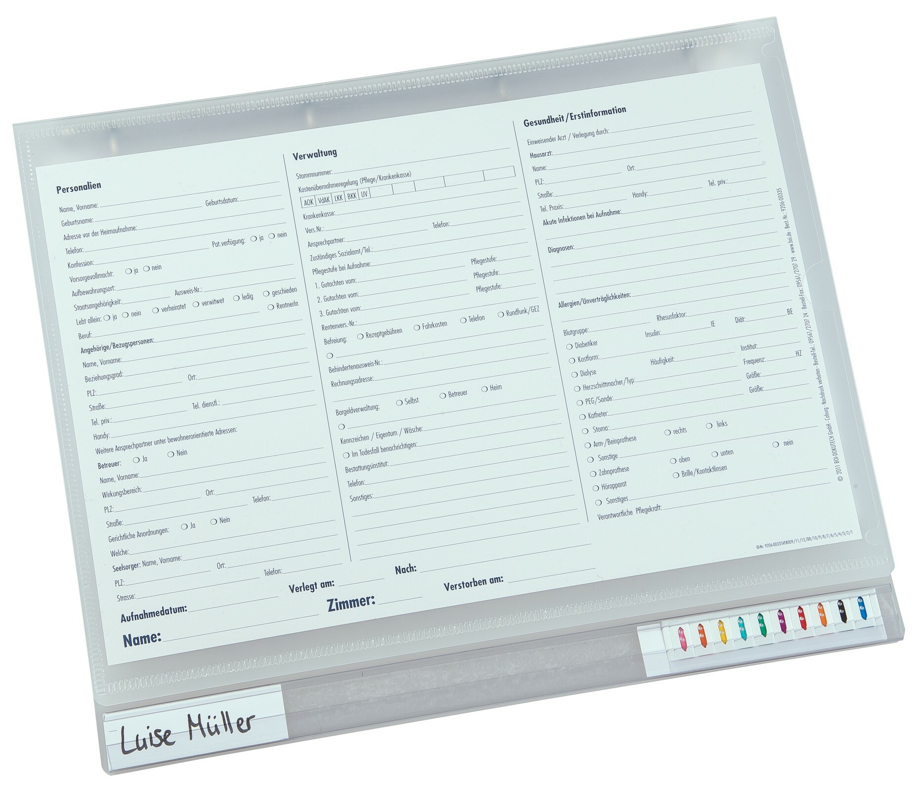 Diese praktische Dokumentationshilfe besticht durch ihre klare Struktur und Übersichtlichkeit. Auf der Vorderseite befindet sich eine DIN A4 Klarsichttasche zur Aufnahme eines Deckblattes. Eine Organisationsleiste mit flexibler Aufteilung für zum Beispiel Namensschild und Übergabereiterleiste bietet zusätzliche Sicherheit auf den ersten Blick.