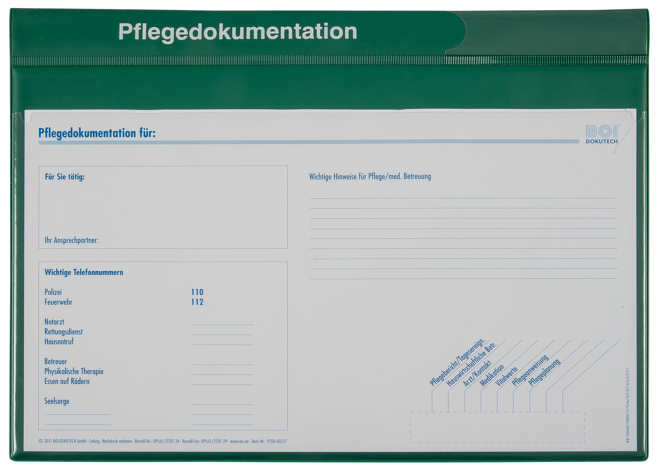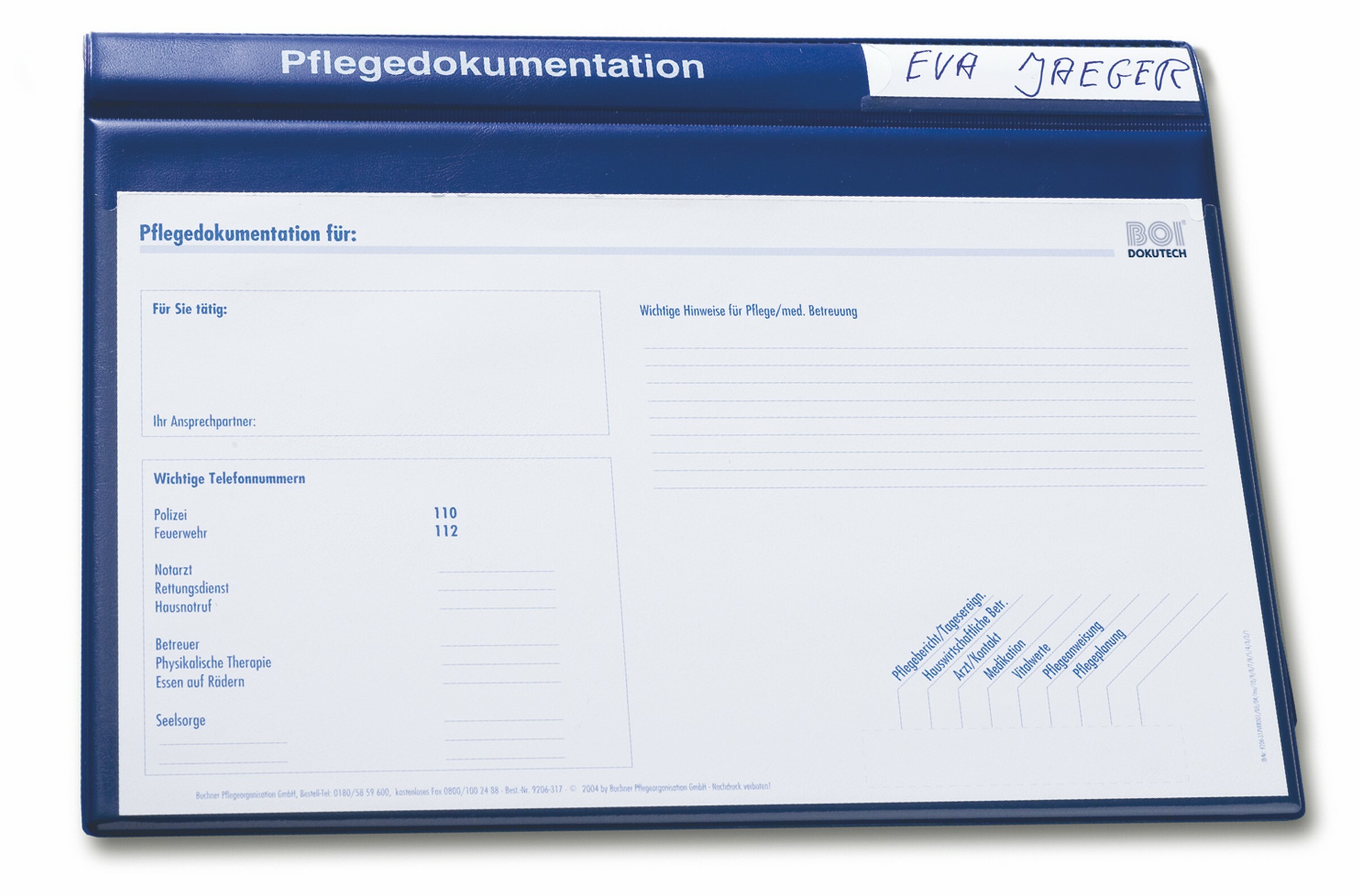 So machen Sie die Dokumentation zur Visitenkarte Ihres Hauses! Durch den Schriftzug "Pflegedokumentation" und die äußere Klarsichttasche zur Aufnahme des Deckblattes (Zubehör: Art. Nr. 9206-00317) sticht Ihre Professionalität hervor.