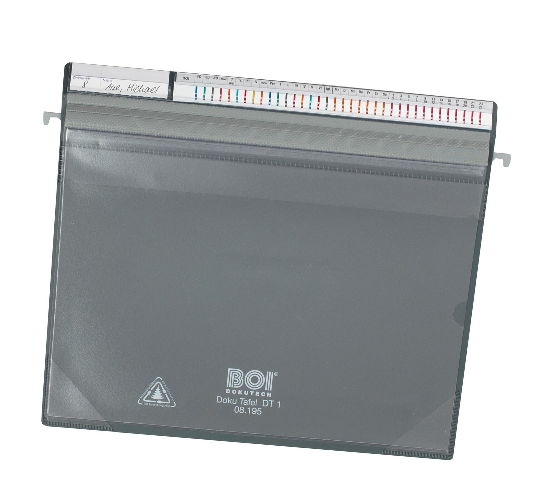 Diese universelle Dokumentationstafel wurde eigens für die Pflegedokumentation konzipiert. Sie besitzt eine transparente Vordertasche und wahlweise eine Klemmleiste oder einen Abheftstreifen zur Fixierung der Formulare.
