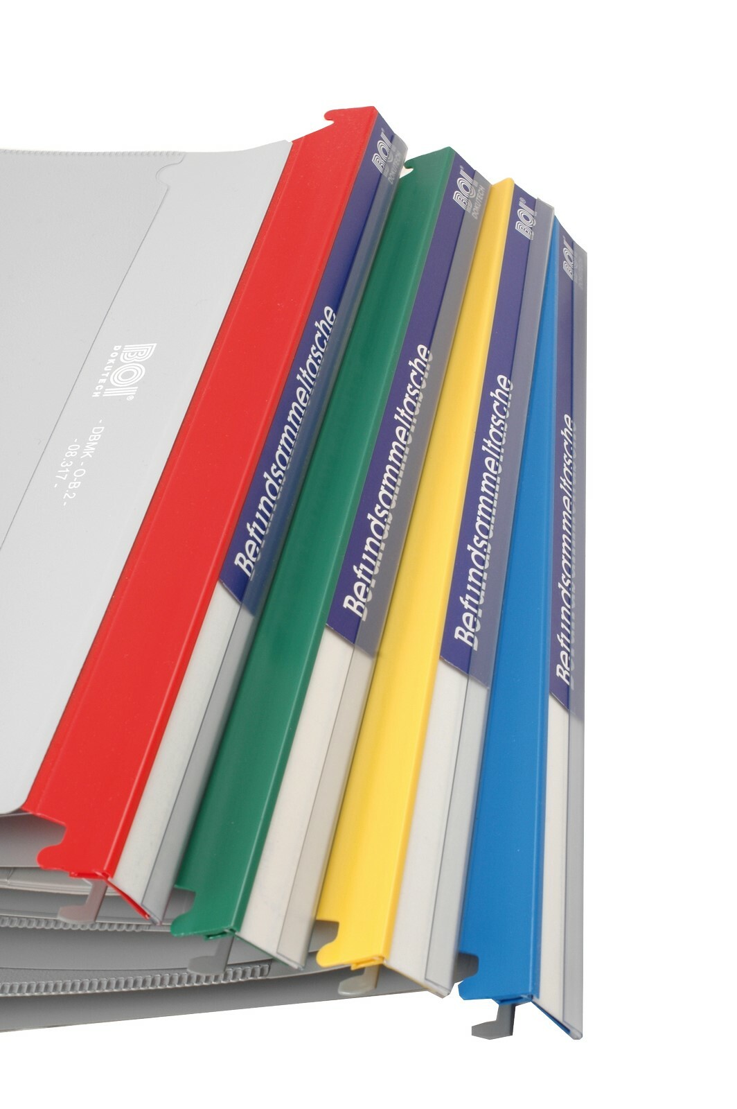 Auf dem äußeren Vorderdeckel der Mappe befindet sich eine Klarsichttasche zu zusätzlichen Aufnahme von Dokumenten. Verschiedenfarbige Trägerschienen helfen bei der Strukturierung Ihres Ablagesystems.