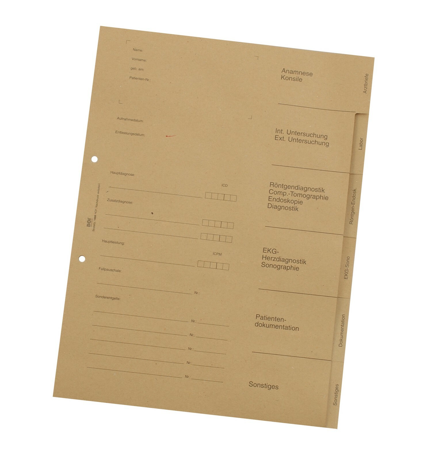 Dieses 6-teilige Register ist mit einer 2-fach Heftlochung versehen. Es besteht aus braunem Recyclingpapier und strukturiert Ihre Dokumentation auf der Station! Die Vorderseiten und Taben unterstützen durch die Beschriftungen "Arztbriefe", "Labor", "Röntgen-Endosk.", "EKG-Sono", "Dokumentation", "Sonstiges".