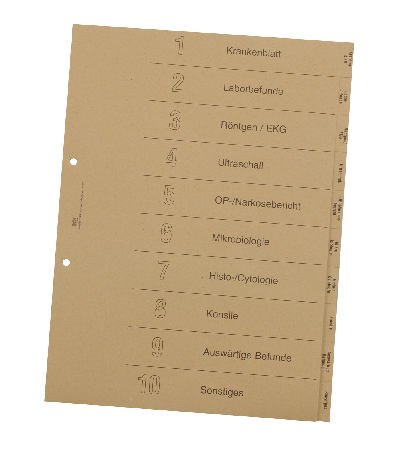 Dieses 10-teilige Register aus Recyclingpapier ist mit einer 2-fach Heftlochung versehen. Es unterstützt Ihre Dokumentation auf der Station detailliert und dennoch übersichtlich!
