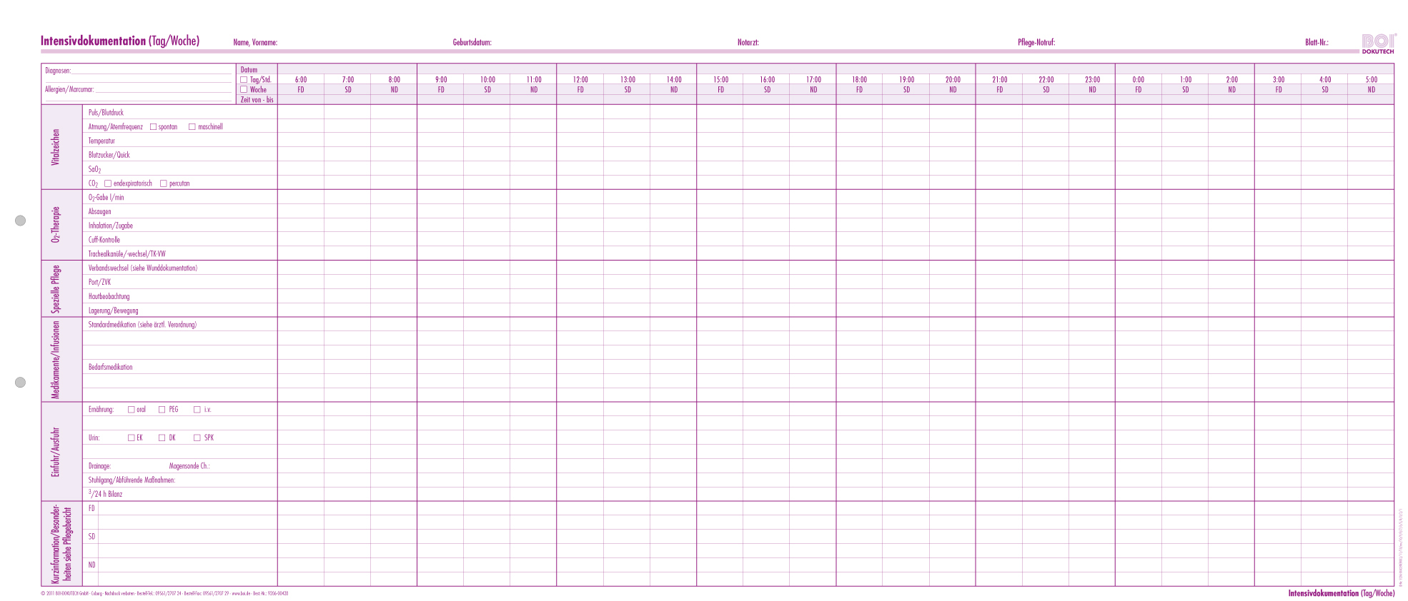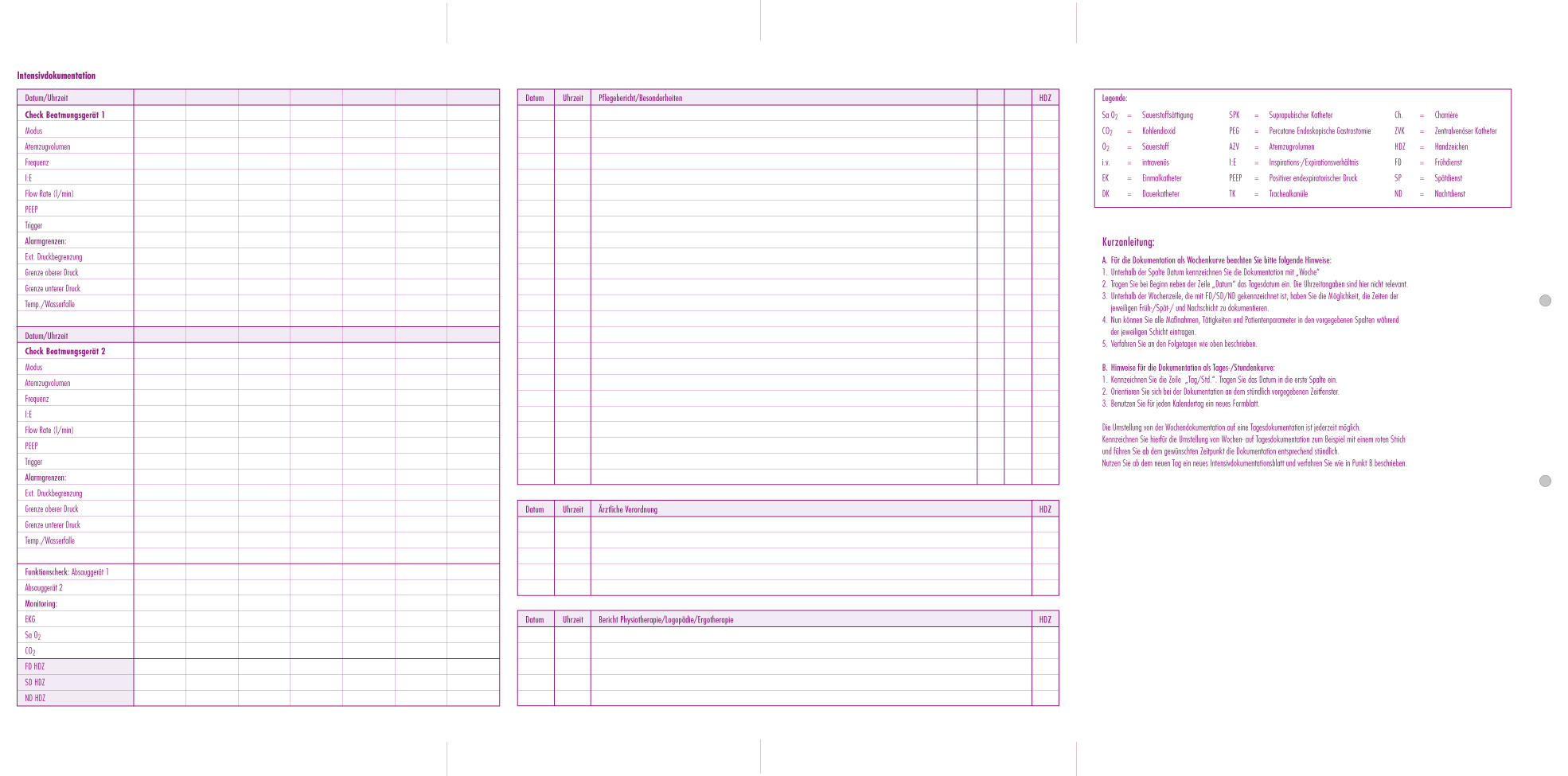 Mit der vorliegenden Intensivdokumentation haben Sie acht Dokumentationsformulare auf einem Formular: 1. Wochenkurve mit der Möglichkeit zur täglichen Dokumentation Ihrer geleisteten Pflege- und Überwachungsmaßnahmen bzw. Patientenparameter. 2. Tageskurve mit der Möglichkeit zur stündlichen Dokumentation Ihrer geleisteten Pflege- und Überwachungsmaßnahmen bzw. Patientenparameter. 3. Erfassung der Medikamentengabe und der Ein-/Ausfuhr. 4. Erstellung einer Bilanz in einem 3-Stunden-Rhythmus bis hin zu einer 24-stündigen Bilanz. 5. Dokumentation von pflegerelevanten Besonderheiten in Form einer Kurzinformation. 6. Dokumentation mehrerer Geräte-Checks für eine Woche oder bei Nutzung als Tageskurve mehrmals pro Schicht. 7. Pflegebericht 8. Ärztlicher Anordnungsbogen und Berichtsfeld der sonstigen Therapeuten.