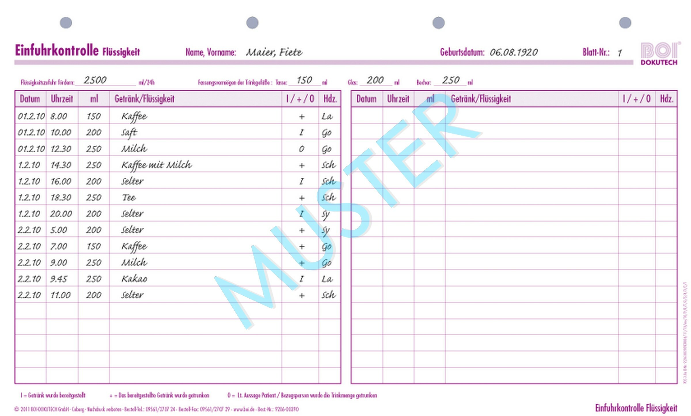 Dokumentieren Sie übersichtlich die bereitgestellte bzw. aufgenommene Flüssigkeitsmenge. Besonders praktisch: Das Fassungsvermögen der Trinkgefäße wird einmalig hinterlegt.