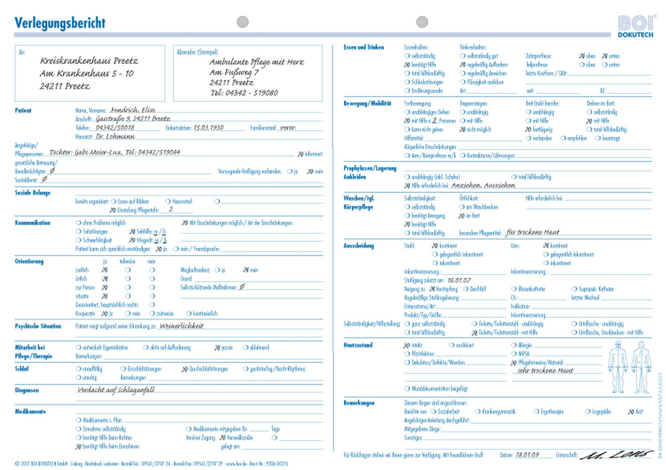 Der schematische Aufbau des Berichtes versetzt Sie in die Lage, in kürzester Zeit einen ausführlichen Bericht zu erstellen. Dieser Bericht sichert die Fortführung der ganzheitlichen Betreuung.