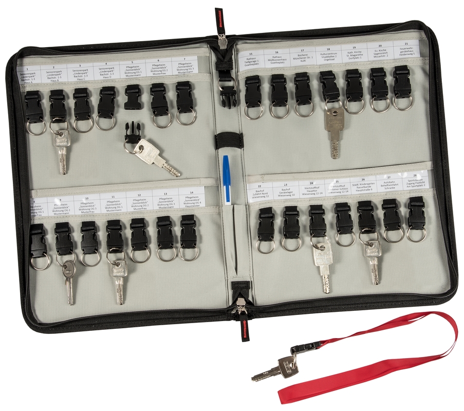 Mapa s 14 ali 28 individualnimi sponkami za kljuce. Notranjost mape je opremljena s popisnimi polji, da lahko oznacite kljuce. Sponko za kljuce lahko obesite na prilozeno vrvico. V mapi XL je prostor se za dve pisali.